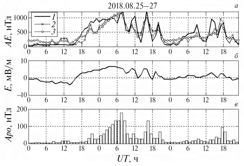 На рис. 5 и рис. 6 (верхняя панель) представлены данные наблюдаемого AE-индекса (кривая 1), результаты расчета по модели (2) − кривая 2, и расчета по модели (4) − кривая 3. Исходные данные для расчетов показаны на средней панели (электрическое поле E) и на нижней панели (планетарный Apo-индекс). На верхней панели видно близкое соответствие модельных расчетов данным наблюдений. На рис. 5 представлена буря с 17 по 19 марта 2018 г., при этом модели близко воспроизводят наблюдательный профиль бури AE-индекса. Пример на рис. 6 относится к буре с 25 по 27 августа 2018 г. На рис. 6 видно хорошее воспроизведение моделями вариаций AE-индекса, несмотря на сложную колебательную структуру его изменений во время бури.