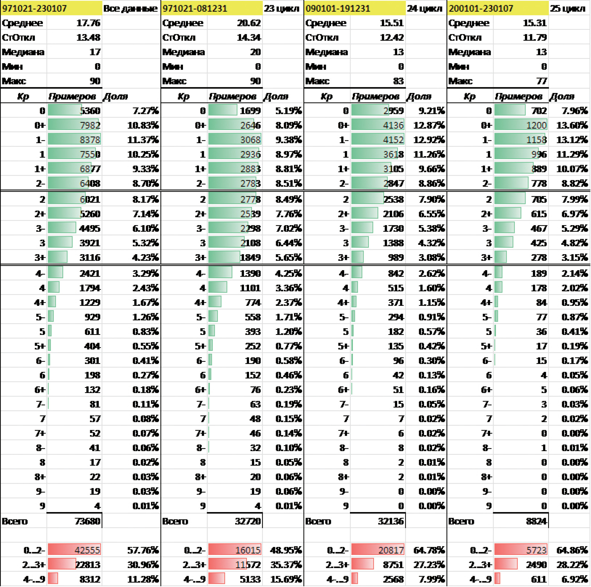 Из четвертого столбца рис. 1, где приведены распределения для текущего, 25 цикла СА, можно увидеть, что для упомянутых выше значений Кр доли составляют 0.41% и 1.29% соответственно, и все распределение в целом повторяет распределение 24-го цикла. Поэтому нами было принято решение создать два набора классификационных моделей: один построен на данных 23 и 24 циклов СА, другой – на данных только 24 цикла.