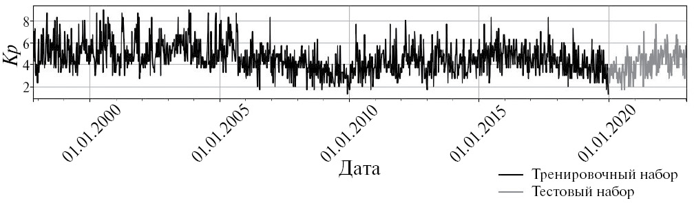 Рис. 2. Недельные максимумы индекса Kp с 1997 года с разбиением на тренировочный и тестовый наборы.