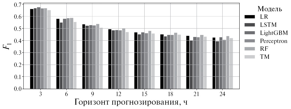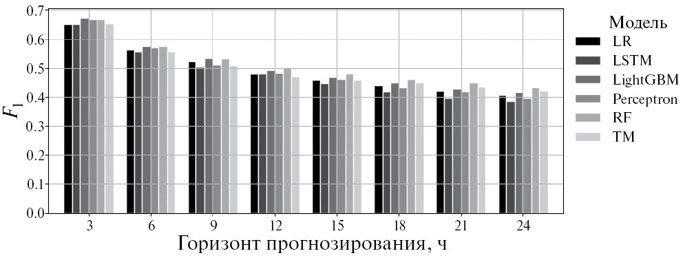 На рис. 4 изображена метрика качества классификации F1 для всех моделей первого типа (обученных на данных 23 и 24 циклов) на всех горизонтах. Последний столбец (TM) – метрика качества для тривиальной модели. Видно, что наилучшей модели превзойти тривиальную модель удается на всех горизонтах.