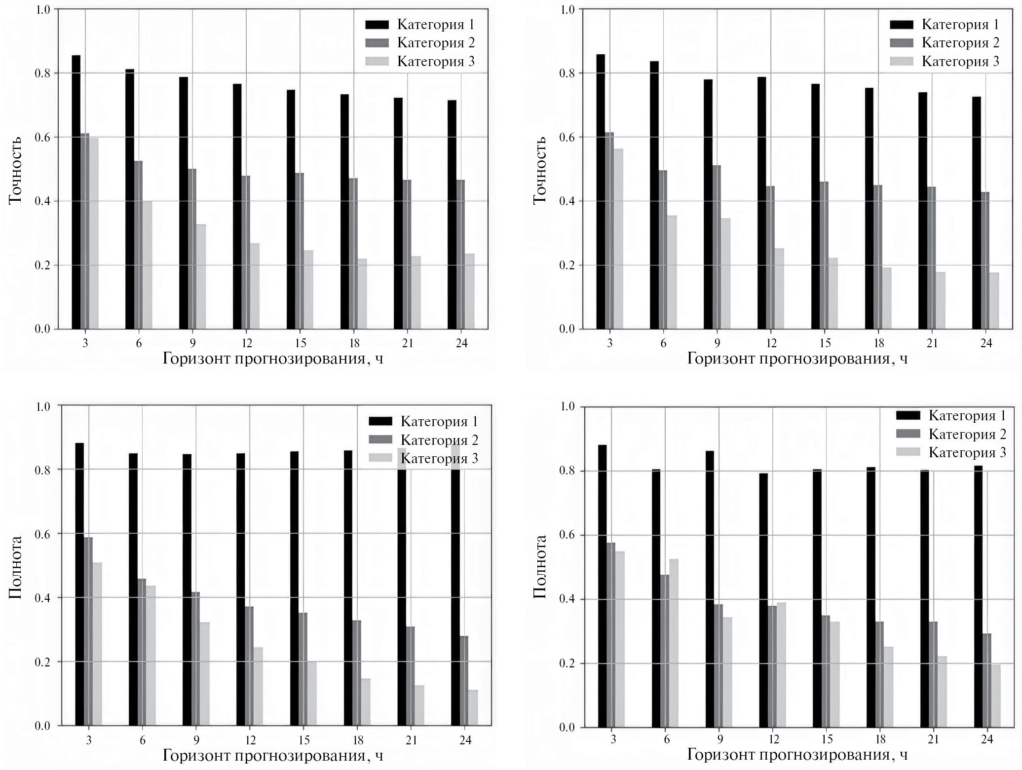 На рис. 7 представлена точность, а на рис. 8 – полнота модели-победителя первого и второго типа для каждого горизонта в разрезе по категориям. Видно, что при монотонном убывании обеих метрик для каждой из категорий с увеличением горизонта прогнозирования наблюдается также вполне ожидаемый эффект, связанный с разной представительностью категорий. Несмотря на использование методики SMOTE для частичного выравнивания представительности, точность и полнота для категорий 2 и 3, соответствующих возмущенной магнитосфере, оказываются кратно ниже соответствующих показателей для категории 1, представительность которой намного выше.