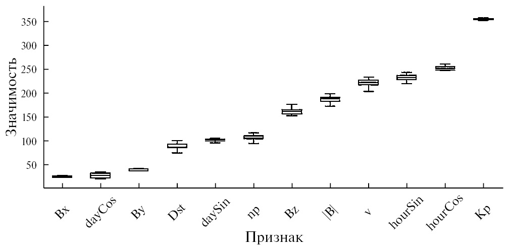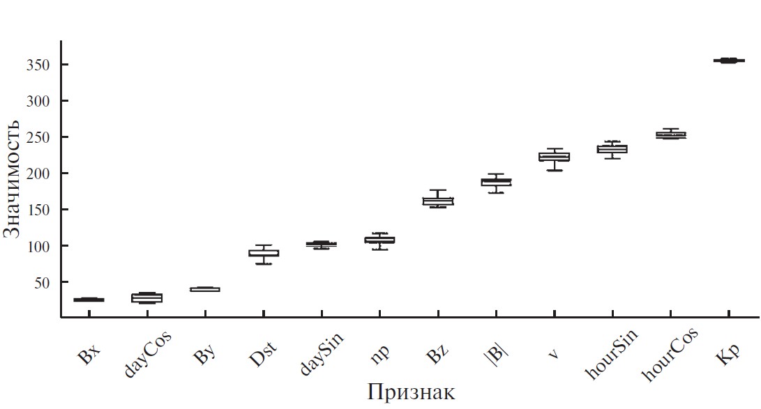 Как видно из рис. 9, максимально значимым является сам индекс Кр, что полностью ожидаемо. Далее по значимости идут две фазы (cos и sin) гармонической функции, соответствующей часу суток, что является не настолько очевидным, но отражает влияние на планетарный индекс распределения наземных станций, которые используются для его определения, по земному шару. Далее по значимости следуют скорость СВ, а также амплитуда и Bz-компонента ММП, что также является объяснимым с точки зрения физики – к Земле приходит корональный выброс массы или высокоскоростной поток СВ, возрастают скорость и плотность, а в случае южного направления ММП развивается геомагнитное возмущение. Относительно низкое (шестое по списку) место Bz может быть объяснено тем, что в данном исследовании используется трехчасовое усреднение временных рядов, а южное (отрицательное) Вz, как правило, сохраняется в течение существенно меньшего времени. Низкие величины значимости для компонент ММП Bx и By полностью согласуются с физическими представлениями и подтверждают правильность методики проведения настоящего исследования.