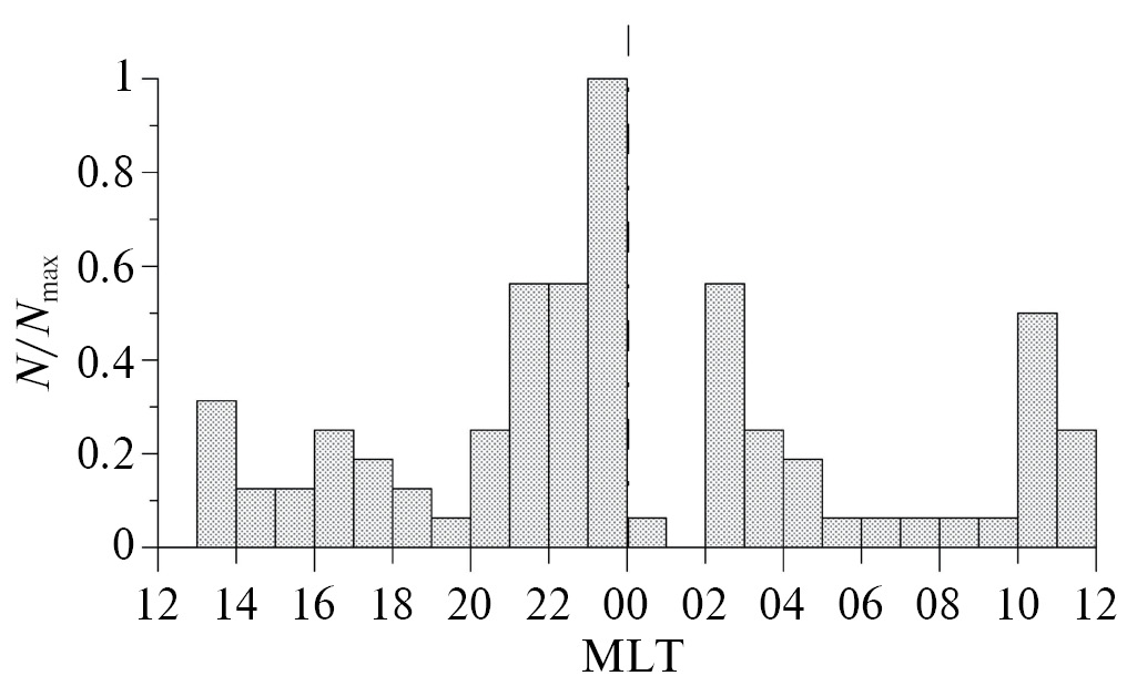 3.2. С целью выяснения, в какое время суток наиболее вероятен эффект наблюдения понижения центральной несущей частоты SE, мы построили суточную вариацию числа часовых интервалов, в течение которых частота f принимает минимальные значения. На рис. 3 представлена зависимость (нормированного на максимальное число случаев) количества часовых интервалов, соответствующих fmin, от локального времени. Как видно из суточной вариации, в доминирующем числе случаев понижение несущей частоты наблюдается вблизи местной полночи (21:00–24:00 MLT). Второй меньший по величине максимум приходится на послеполуночные часы (02:00–04:00 MLT). Таким образом, понижение несущей частоты SE преимущественно наблюдается тогда, когда обс. Восток оказывается в основном в ночном секторе магнитосферы.