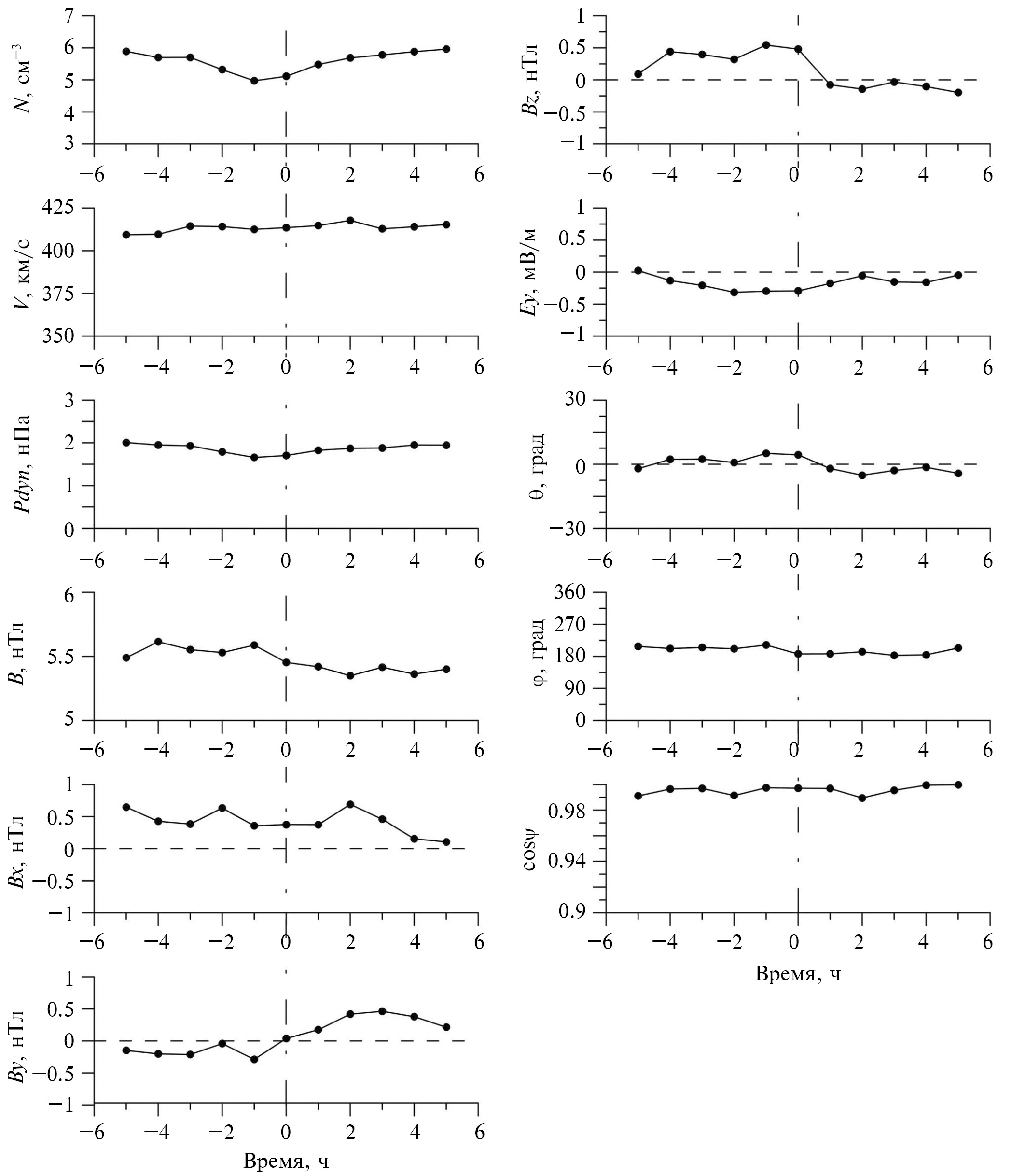 На рис. 5 представлена динамика усредненных часовых значений вышеперечисленных параметров. Как видно из рис. 5, как до нулевой точки, так и после поведение параметров плазмы солнечного ветра N, V, Pdyn и модуля B ММП было относительно стабильным. Вблизи реперной точки в их динамике не наблюдалось флуктуаций, которые могли бы быть своеобразным триггером понижения несущей частоты серпентинной эмиссии. Средние значения этих параметров соответствовали условиям невозмущенной магнитосферы. Bx-компонента ММП сохраняла положительное направление до и после репера (в течение 10 анализируемых часов). By- и Bz-компоненты ММП изменили направление вблизи нулевой точки. Однако это никаким образом не отразилось на ориентации вектора ММП в плоскости эклиптики и в плоскости, ей перпендикулярной. Динамика углов q и j оставалась относительно стабильной до и после нулевой точки. В поведении Ey-компоненты электрического поля солнечного ветра также не обнаружено существенных флуктуаций. Вариация угла y, ответственного за режим модуляции серпентинной эмиссии, также не была подвержена существенным изменениям, которые могли бы спровоцировать понижение несущей частоты данного излучения.