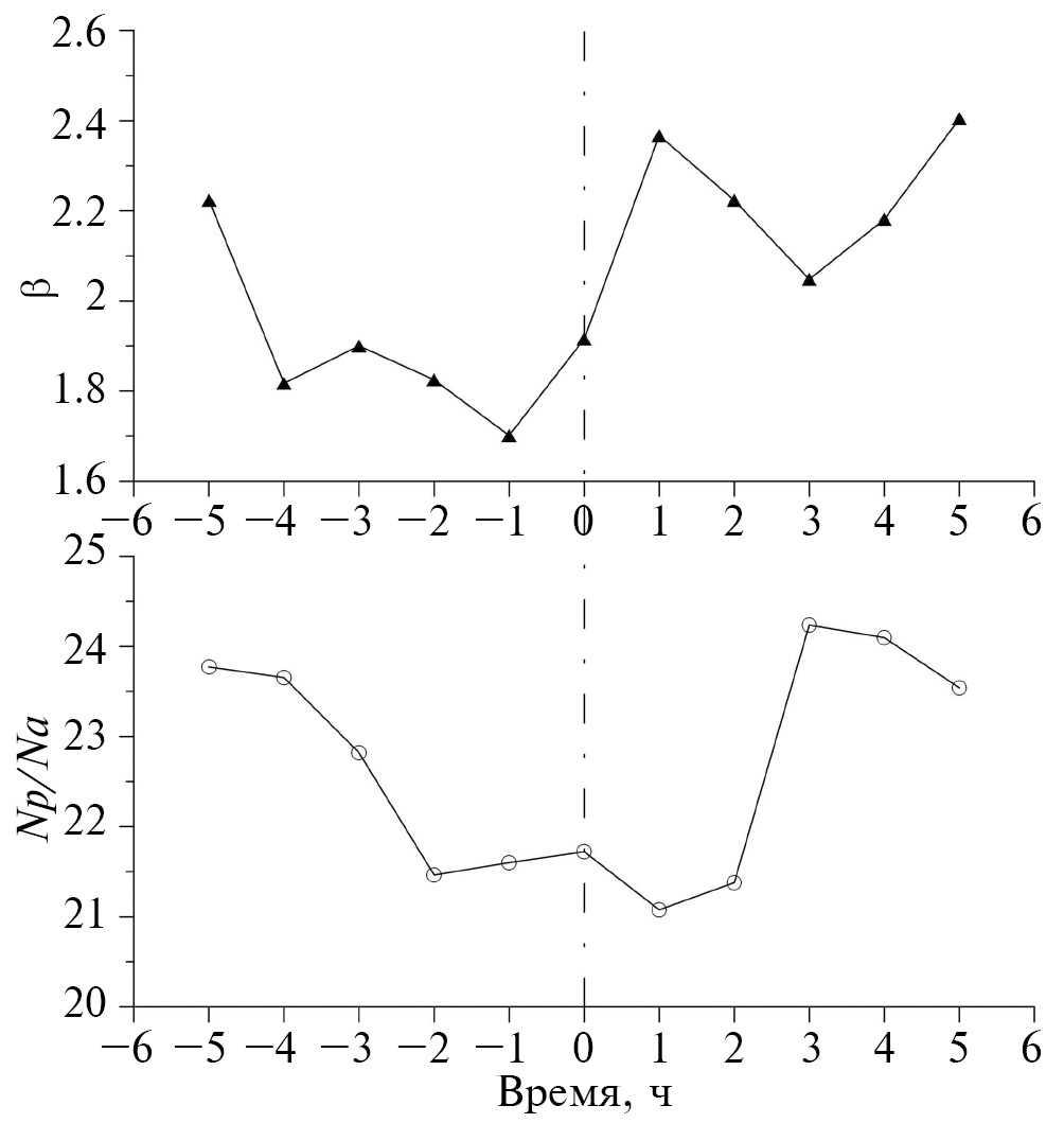 Наиболее значимые изменения вблизи реперной точки мы обнаружили в динамике двух параметров межпланетной среды. Одним из них является параметр β, другим ‒ Np/Na (соотношение плотности протонов к плотности α-частиц). Здесь заметим, что в базе данных OMNI представлено соотношение плотности α-частиц к плотности протонов Na/Np. Для удобства сопоставления с поведением несущей частоты SE мы использовали параметр Np/Na. На рис. 6 представлена динамика β параметра и соотношения Np/Na, полученная методом наложения эпох для всех случаев наблюдения понижения несущей частоты SE.