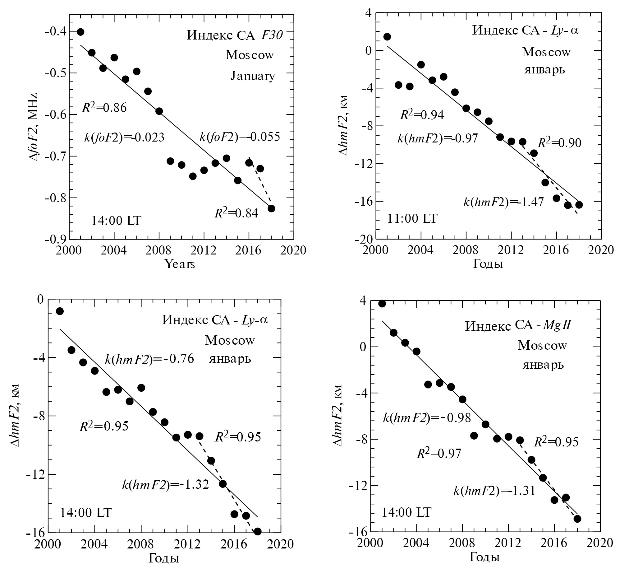 Изменение ΔhmF2 со временем в январе и феврале для ст. Moscow представлено на рис. 1 и рис. 2. Известно (см., например, [Данилов и др., 2023б]), что тренды критической частоты слоя F2, foF2 наиболее выражены в зимние месяцы. Как видно из приведенных рисунков, для всех использованных индексов СА в течение анализируемого периода наблюдается уменьшение ΔhmF2 со временем. Линейная аппроксимация этого уменьшения (сплошная линия) дает отрицательный тренд высоты, k(hmF2). На всех рисунках и во всех таблицах величины k(hmF2) приведены в единицах км/год.