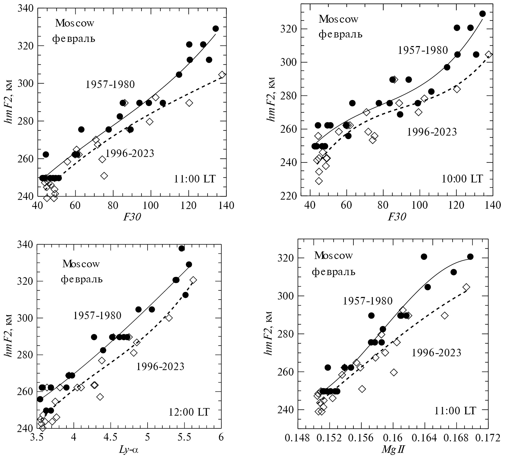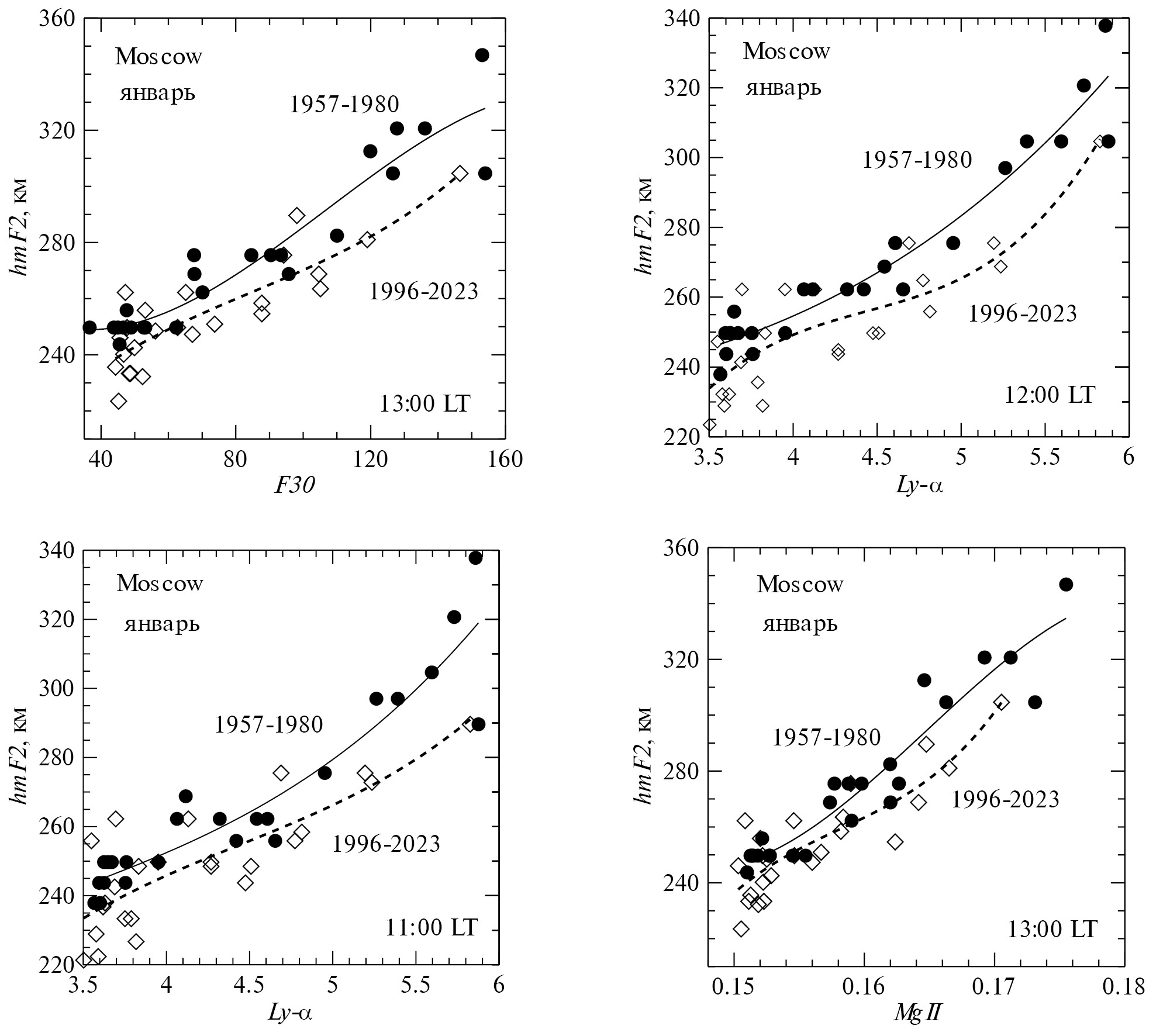 Как видно на этих рисунках, во всех рассмотренных ситуациях (месяц, индекс СА, момент LT) аппроксимирующие кривые идут систематически выше для данных 1957–1980 гг., чем для данных 1996–2023 гг. Иначе говоря, для одного и того же уровня СА (для одного и того же значения индекса СА) величина hmF2 для анализируемого периода меньше, чем для “эталонного” периода. А это значит, что тренд высоты hmF2 отрицателен, т.е. происходит систематическое уменьшение величины hmF2 со временем. Этот вывод полностью согласуется с результатами (отрицательные тренды hmF2), полученными с использованием основного метода и описанными в параграфе 2.