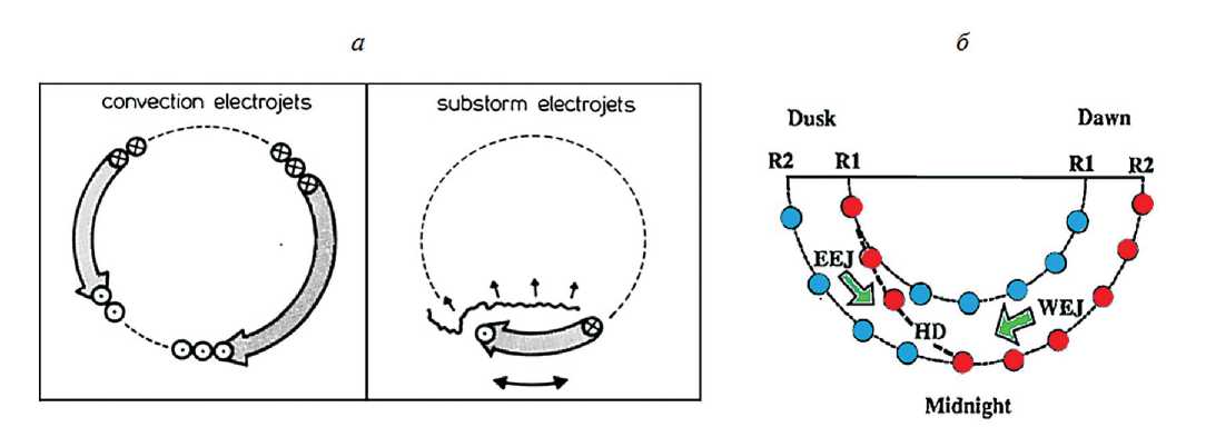 Рис. 1. (а)− Схема конвективной бухты и магнитосферной суббури из работы [Baumjohann, 1983]; (б)− схема токов в разрыве Харанга из работы [Koskinen and Pulkkinen, 1995]