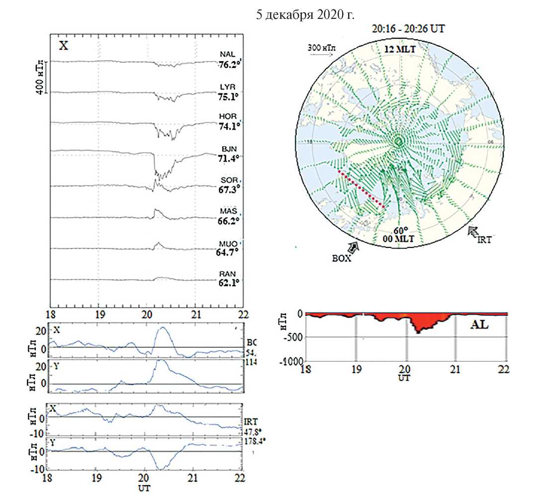 На рис. 3 подробно рассмотрено одно из типичных событий “полярных” суббурь 5 декабря 2020 г. Слева показаны магнитограммы IMAGE, на которых видно резкое начало “полярной” суббури около 20.10 UT на ст. BJN (71.4° MLAT), а ниже на ст. SOR (67.3° MLAT), регистрируется уже положительная магнитная бухта, их разделяет море и разрыв Харанга, расстояние между станциями около 400 км. На среднеширотной обс. Борок (BOX, 114° MLON, 54.4° MLAT) видна четкая положительная магнитная бухт в Х-компоненте поля и четкая положительная бухта в Y-компоненте поля, указывающая на то, что источник этой суббури находится к востоку от данного меридиана. На рис. 3 также показана магнитограмма среднеширотной обс. Иркутск (IRT, 179° MLON, 47.8° MLAT), находящейся 65° восточнее Борка. Видно, что в Иркутске регистрируется отрицательная бухта в Y-компоненте поля, что означает, что источник суббури находится к западу от Иркутска, следовательно, между Борком и Иркутском.