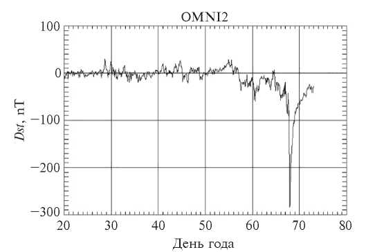 Полученные спутником Космос-321 данные представляют большой интерес для изучения вариаций полей именно магнитосферного и ионосферного происхождения, поскольку за период измерений наблюдался максимум солнечной активности. Удачным образом за 53-дневный период его функционирования имела место сильная геомагнитная буря, которая произошла 8−9 марта 1970 г. Об этом свидетельствуют значения индекса геомагнитной активности Dst, опустившиеся до –284 нТл (рис. 1), что классифицирует указанное событие как супербурю (Dst ≤ –250 нТл). Именно этому событию, редкому с точки зрения наличия для него спутниковых наблюдений, и посвящено настоящее исследование.