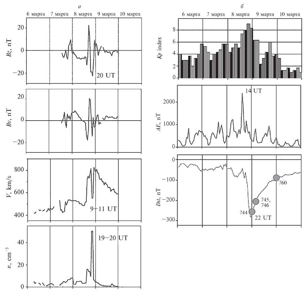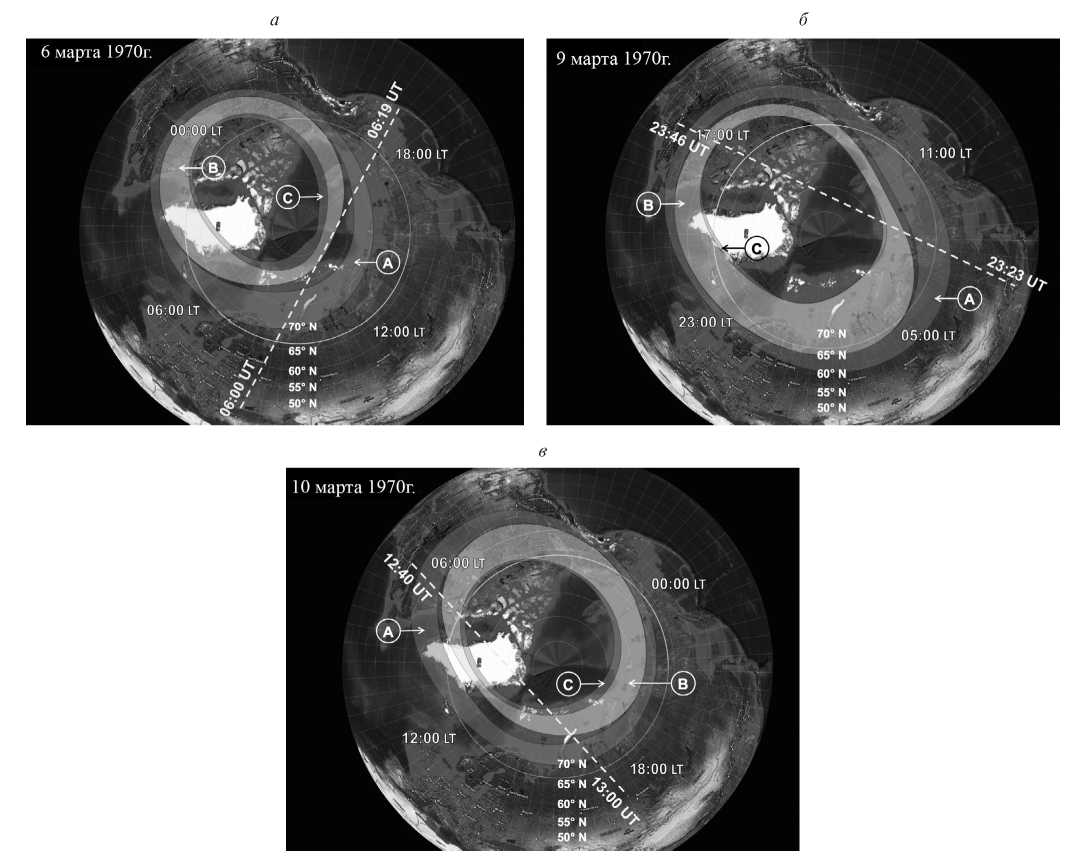 Для диагностики околоземного пространства привлечем к исследованию наземные данные о вариациях магнитного поля. Рассмотрим за 6−10 марта 1970 г. значения индексов геомагнитной активности, которые вычисляются по наземным наблюдениям магнитного поля, отражающие (1) уровень геомагнитной возмущенности в планетарном масштабе (Kp-индекс), (2) интенсификацию токов вдоль границ аврорального овала в субполярной зоне ионосферы (AE-индекс) и (3) интенсивность кольцевого тока (Dst-индекс) (рис. 2б). К сожалению, PC-индекс для оценки геомагнитной активности над полярной шапкой, вызванной изменениями межпланетного магнитного поля, до 1975 г. недоступен. С 6 марта наблюдался уверенный рост значений Kp-индекса с 3 баллов до 8.5 (максимальное значение Kp-индекса составляет 9 баллов), которое было достигнуто к 20−21 UT 8 марта, после чего последовали довольно резкий спад до середины 9 марта и снова всплеск до 6 баллов около 17 UT того же дня. Анализируя значения Dst-индекса можно наблюдать характерное для масштабной бури бухтообразное ослабление магнитного поля до почти –300 нТл около 22 UT 8 марта, совпадающее по времени с пиковым значением Kp-индекса. Этот период характеризует главную фазу геомагнитной бури, после которой последовала медленная фаза восстановления. На графике AE-индекса максимальный пик наблюдается около 14 UT 8 марта; следующий за ним изолированный всплеск приходится на 9 марта, в районе 17 UT. Первый пик, составляющий ~2300 нТл, связан с общей активизацией электромагнитных процессов в полярной шапке, а второй, достигающий ~900 нТл, – с активизацией суббуревой активности на фоне восстановительной фазы бури.