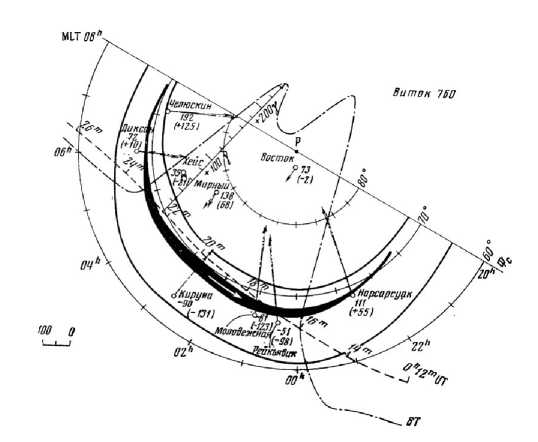 Однако, в [Долгинов и др., 1972] приведены полярные проекции траектории спутника за витки 744, 746 и 760 при его пересечении полярной шапки южного полушария в ночные часы по местному магнитному времени с отображением измеренной магнитной вариации и указанием положения аврорального электроджета (рис. 4). Высота спутника при этом составляла 290−330 км.