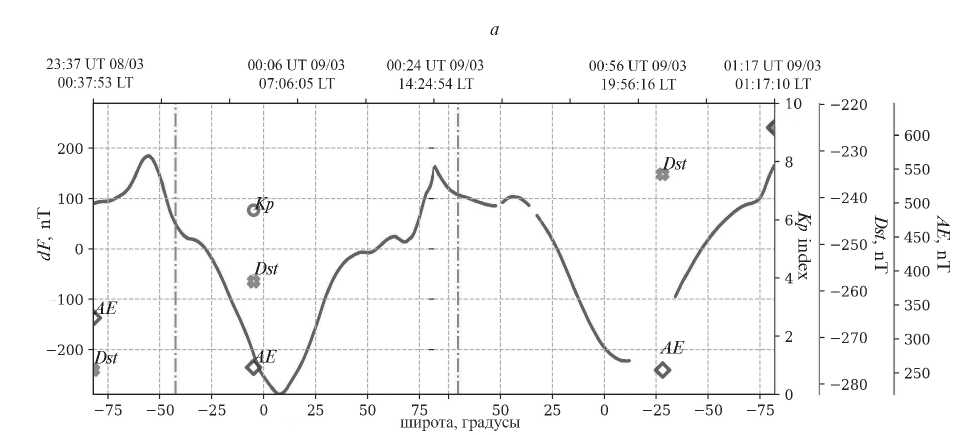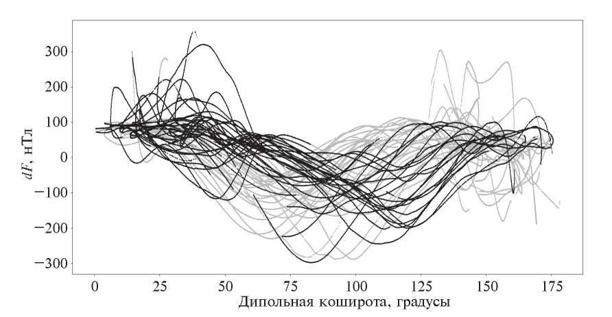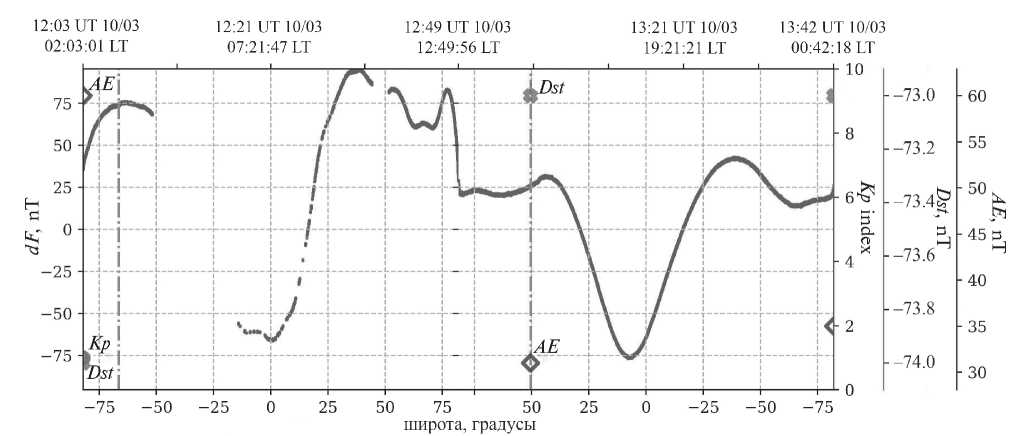 Для более подробного изучения этого события с привлечением спутниковых наблюдений единственным вариантом остается использовать данные аналогичной спутниковой миссии OGO-6, выведенной на полярную орбиту в тот же период времени [Jackson and Vette, 1975]. Приполярные ионосферные токовые системы во время сильных геомагнитных возмущений имеют сложную конфигурацию. Для разделения их вкладов на ночной/дневной стороне в северном/южном полушарии требуется преобразование времен отсчетов из UT в местное время (LT). Это дает возможность понять, где в каждый момент времени находился низкоорбитальный спутник с учетом его квазигелиосинхронной орбиты. Кроме того, интерес представляет только возмущенная составляющая МПЗ, т.е. его вариации относительно некоторого базового уровня. Наблюдаемое на высоте пролета спутника магнитное поле складывается из сигналов внутренних источников (литосферное и главное поля) и внешних (локализованное поле ионосферного происхождения и масштабное магнитосферное). Литосферное магнитное поле быстро затухает с увеличением расстояния от источника, поэтому на орбите спутника высотой несколько сотен километров его сигнал достаточно слаб. Таким образом, для изучения интересующих нас внешних источников необходимо из наблюдений вычесть вклад главного поля, имеющего масштабную пространственно-временную изменчивость. Для этого воспользуемся моделью IGRF [Alken et al., 2021] и рассчитаем модельные значения поля в каждой точке наблюдений. Величина dF, получившаяся в результате вычета модельных значений главного поля из наблюденных значений, и будет в основном содержать в себе вклад внешних источников (рис. 5).