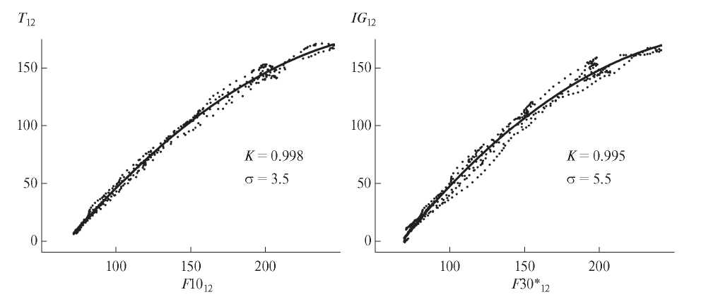 Рис. 1. Зависимости ионосферных индексов T12 и IG12 от солнечных индексов активности F1012 и F30*12 по данным измерений и уравнениям регрессии (5) – точки и сплошные линии; K и σ – коэффициенты корреляции и стандартные отклонения этих уравнений.