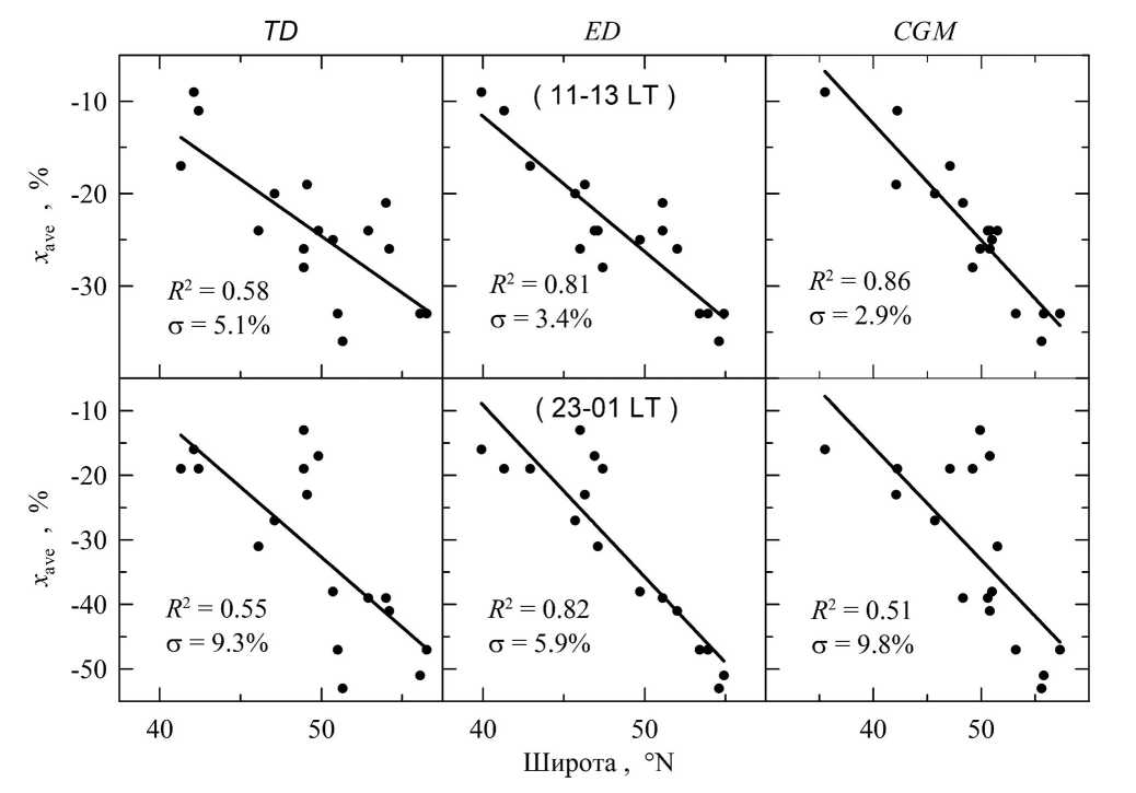 Не менее важным является очень большой диапазон изменений xave между анализируемыми станциями: |xave| = 22±16% и |xave| = 28±19% для дневных и ночных часов. Эффекты ионосферных возмущений в периоды повышенной геомагнитной активности зависят от широты, поскольку источник этих возмущений расположен в высоких широтах. В качестве таких широт можно выбрать широты в координатах ED, TD или CGM и оценить, которая из них является более точной для описания возмущений в ионосфере средних широт в периоды повышенной геомагнитной активности. Для этого по данным xave в таблице 1 были определены коэффициенты уравнений регрессии (a и b) и статистические свойства этих уравнений