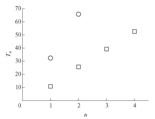 На рис. 3 приведены графики зависимости значений периодов от номеров спектральных линий n, рассчитанных по формулам (27) и (28). Из графиков следует, что в спокойных условиях величина периода основного максимума, соответствующего , составляет примерно 30 мин. Это соответствует среднемасштабным колебаниям, которые регулярно наблюдаются в спокойных условиях. Они могут быть связаны с влиянием ветра в ионосфере на распространение фоновых ВГВ, источники которых расположены в атмосфере. В процессе подготовки землетрясения в ионосфере возникает дополнительное электрическое поле. Связанная с ним сила Ампера модифицирует спектр колебаний таким образом, что появляются короткие периоды колебаний порядка 10 и 25 мин. Факт появления дискретного спектра связан с наличием силы Ампера в переходном слое, в котором ≠ 0.