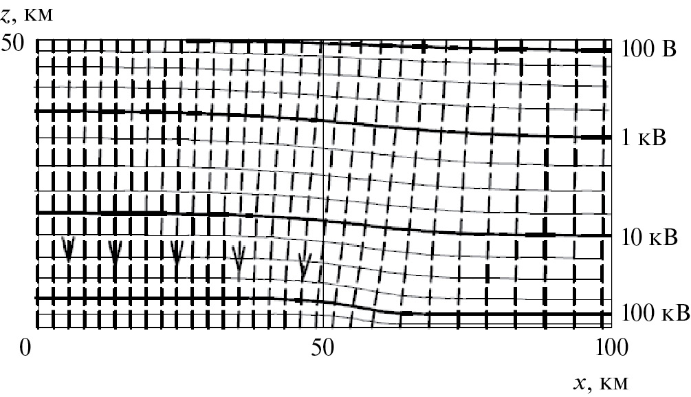 На рис. 2 показаны распределение потенциала и линии тока в вертикальной полуплоскости y = 0, x > 0 в атмосфере над областью эманации радона. При отрицательных x картина практически симметрична. Напомним, что точка x = y = 0 является центром области эманации радона. Поскольку значения потенциала изменяются на много порядков, эквипотенциали построены с одинаковым шагом в логарифмической шкале, между соседними жирными линиями изменение в 10 раз, тонкие построены вчетверо чаще. Штриховыми линиями показаны линии тока, начальные точки которых равномерно расположены с интервалом 5 км × 2 пА/м2 на высоте 50 км. Линии тока указывают направление тока. В двумерном случае постоянен ток, пересекающий любой отрезок, соединяющий точки соседних линий тока. В рассматриваемом трехмерном случае второе свойство отсутствует, поэтому необходимо конкретизировать высоту, на которой линии тока расположены с указанным интервалом. Эта высота взята равной 50 км.