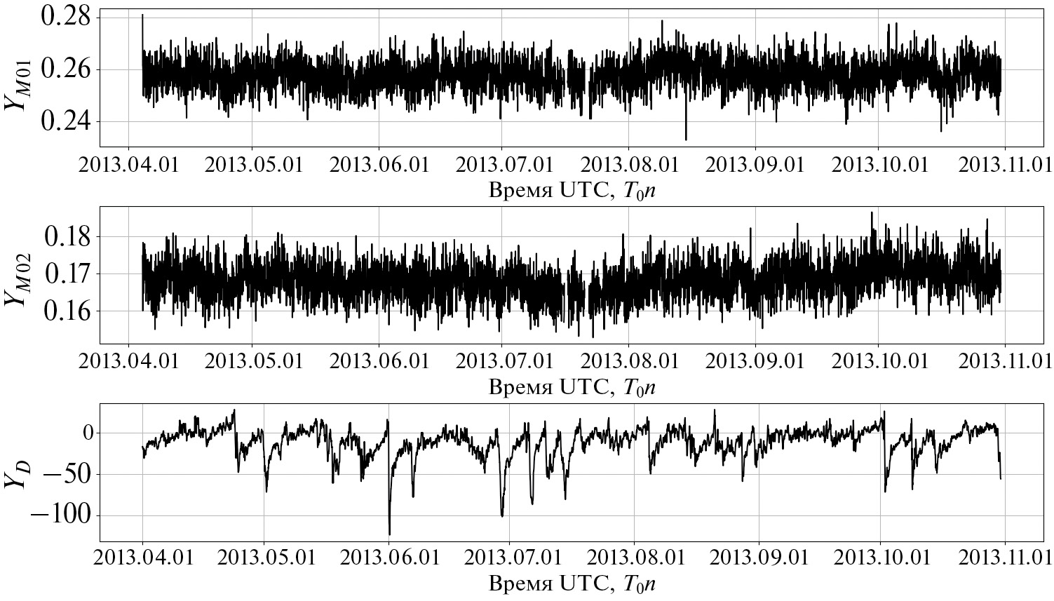 На рис. 2 помещены примеры графиков фрагментов исходных переменных, YM01 (n) = YM01 (i01, j01, T0n), i01 = 12, j01 = 27, YM02 (i02, j02, T0n), i02 = 22, j02 = 15 и функции Dst-индекса YD (n) = YD (T0n) для семимесячного временного участка 01.04.2013–31.10.2013. Отчетливо видно, что средние значения переменных YM01, YM02, для зенитных индексов j01 = 27 и j02 = 15 заметно различаются.