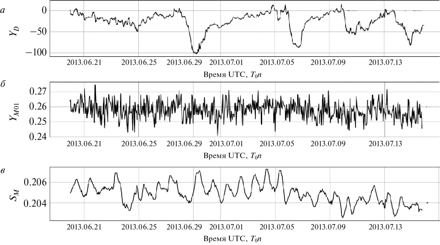 Для пояснения особенностей возможных функциональных связей между МГ-наблюдениями и значениями Dst-индекса на участке с начальной – конечной датой 2013.06.20 – 2013.07.16 с укрупненным временным масштабом по сравнению с рис. 2 для YM01 (n) и YD (n) с n1 ≤ n ≤ n2 и n1 = 4101, n2 = 4678, соответствовавших указанным датам, были произведены расчеты, результаты которых приведены на рис. 3: (а) – график функции Dst-индекса YD (n); (б) – график переменной YM01 (n); (в) – график функции усреднения SM (T0n).
