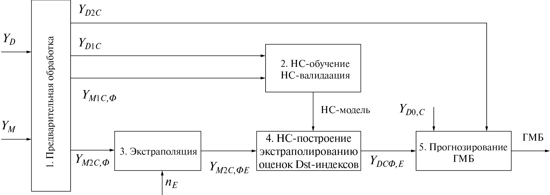 В блоке 1 производится предварительная обработка информации. На его вход подаются временные ряды пакетов Dst-векторов YD и матриц МГ-наблюдений YM. На выходе формируются: временные ряды пакетов центрированных Dst-векторов YD1C, центрированных отфильтрованных пакетов матриц МГ-наблюдений YM1C, Ф и временные ряды пакетов центрированных и отфильтрованных пакетов матриц МГ-наблюдений YM2C, Ф. В блоке 2 на основе YD1C, YM1C, Ф осуществляется процедуры обучения и валидации, в результате которых формируется НС-модель. В блоке 3 для переменных YM2C, Ф реализуется их экстраполяция на nE шагов, выход этого блока обозначается, как YM2C, ФE. В блоке 4 на основе использования НС-модели и экстраполированных переменных YM2C, ФE вычисляются скалярные оценки экстраполированных Dst-индексов YDCФ, E. В блоке 5 с применением сравнений экстраполированных переменных YDCФ, E и порога YD0, C производится принятие решений о прогнозировании ГМБ; также в блок 5 поступает YD2C для оценивания вероятностей правильного и ложного прогнозирования.