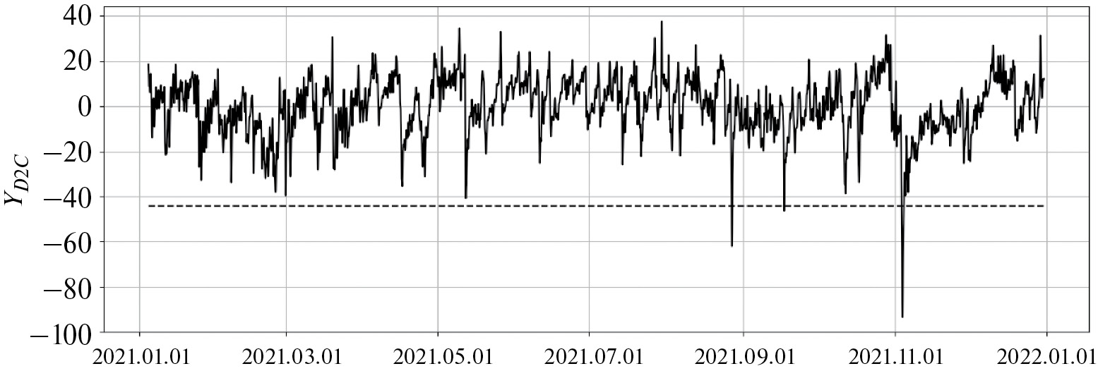 Правило принятия решений по прогнозированию ГМБ основывалось на процедуре бинарной классификации – сравнении вычисленных прогнозированных оценок Dst-индекса YDC (n, nE, nd) по формуле (3) из п. 3 с центрированным порогом YD0, C. Реализация сравнения производилась путем рассмотрения неравенств со значениями Dst-индекса и порогами для индексов n временного участка валидации