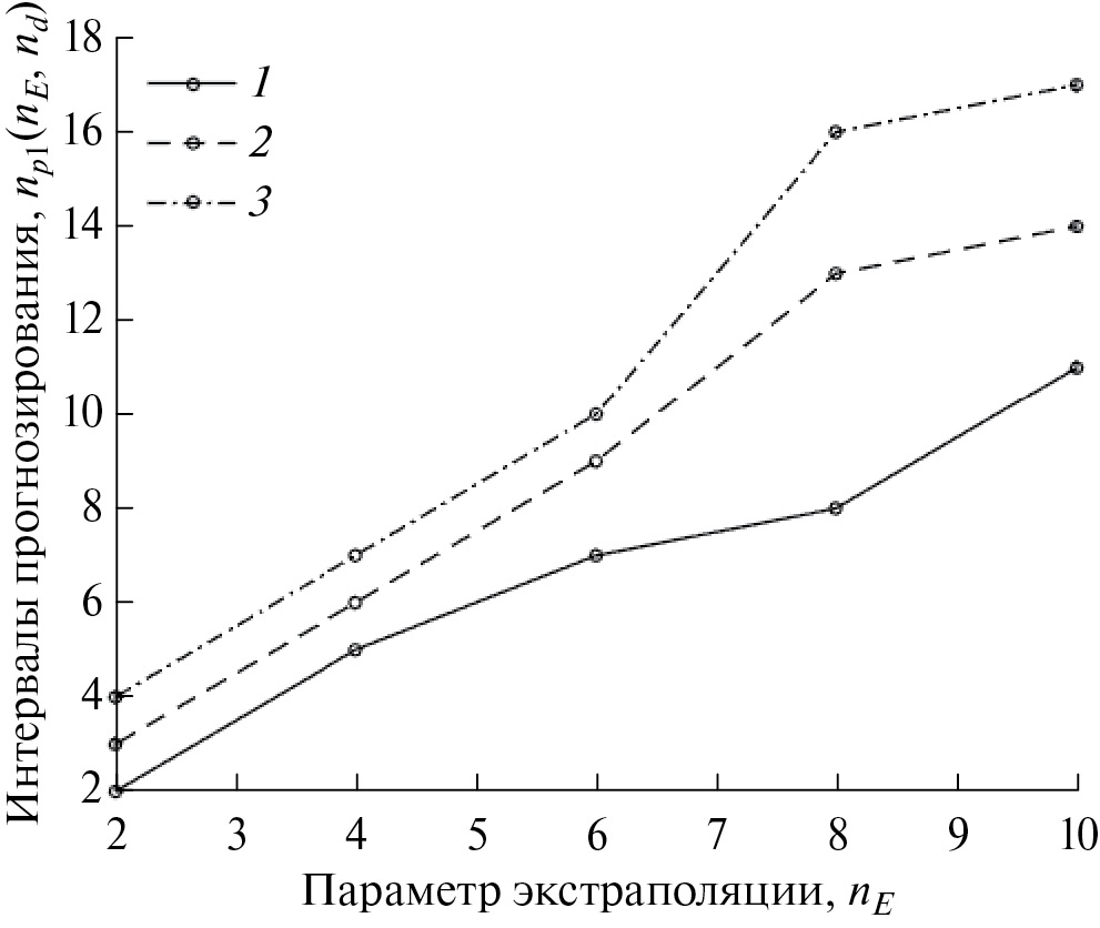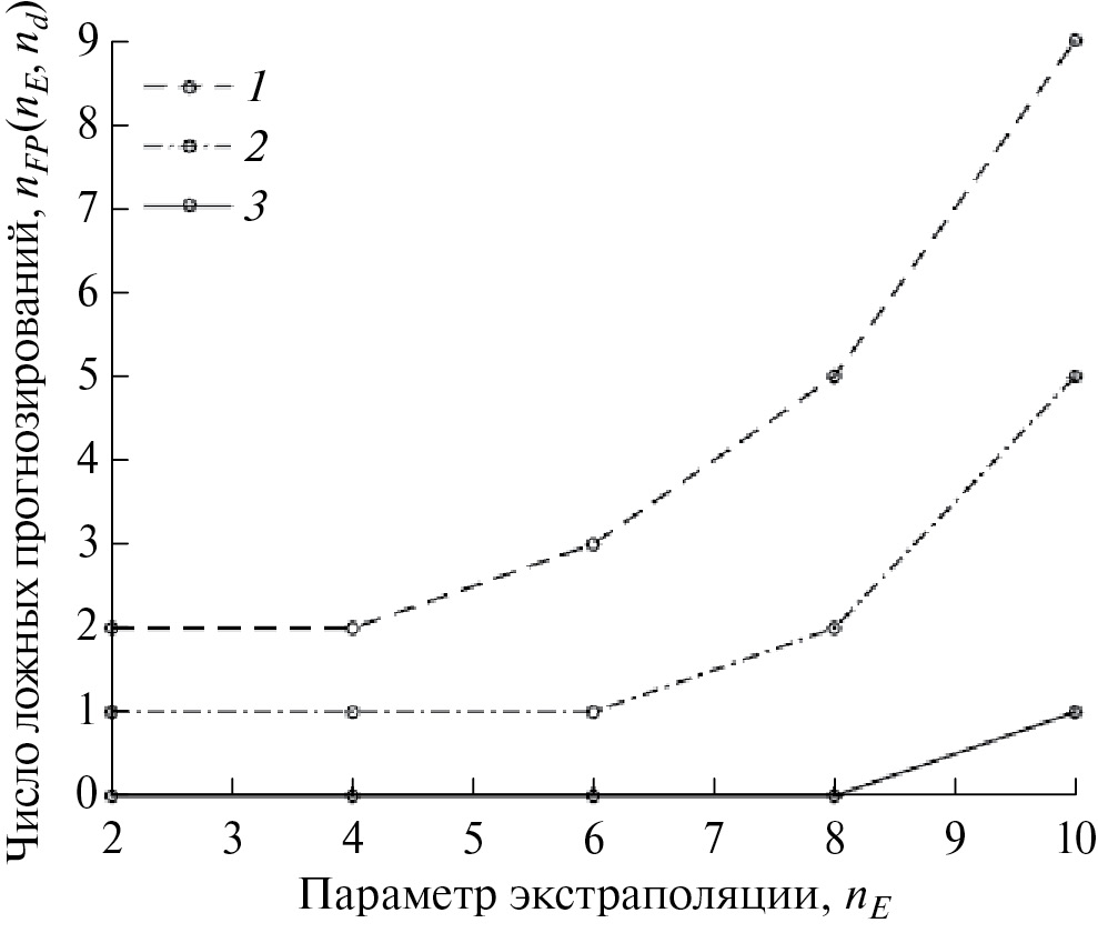 Рассматривались участки прогнозирований ГМБ (11) на основе вычислений из табл. 2 разностей dnp (r, s, nE, nd, YD0, C) = n1 (r, YD0, C) − n2 (s, nE, nd, YD0, C). Формировались оценки , . В табл. 3 для nE = 1, 2, ..., 10 и nd = 5 приведены результаты расчетов dnp1 (nE, nd), dnp3 (nE, nd) – оценок интервалов прогнозирований ГМБ и числа ложных прогнозирований nFP (nE, nd) для nE = 1 ÷ 10.