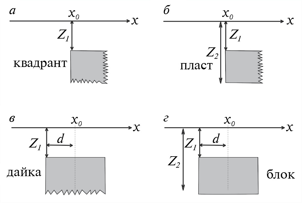 Рис. 1. Геометрия и параметры 2D геофизических моделей. (а) – квадрант, полубесконечное по вертикали и горизонтали тело; (б) ‒ пласт, полубесконечный по горизонтали слой; (в) ‒ дайка; (г) ‒ блок.