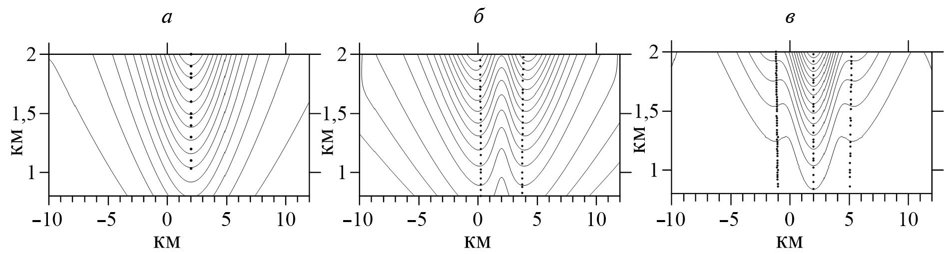 По вейвлет-спектру мы можем определить положение экстремумов производных разного порядка. У квадранта два параметра: x0 – координата угловой точки сечения и z1 – глубина до верхней кромки (далее, просто глубина). Согласно (П1) экстремум первой производной достигается в угловой точке x0. А два экстремума второй производной с координатами x± =x0±√3/3z1 (П2) позволяют оценить глубину z1. Третья производная имеет три экстремума: центральный совпадает с положением угловой точки, расстояние от двух боковых до центра равно глубине (П3). Пример определения параметров квадранта с заданными параметрами x0 = 2 км и z1 = 3 км показан на рис. 2. На рисунке 2 x-координата задана в км, масштабы пересчитаны в км, сплошными линиями показаны изолинии модулей вейвлет-коэффициентов для трех производных. Для каждой производной точками обозначены координаты локальных максимумов. Хорошо видно, что эти точки выстраиваются в прямые, параллельные оси масштабов. По пересечениям этих прямых с осью x были определены параметры квадранта. В результате по 1-й производной (П1) получено значение x0 = 2.01 км (рис. 2а), по 2-й производной (П2) – x0 = 2.005 км и z1 = 3.003 км (рис. 2б), по 3-й производной (П3) – x0 = 2.0 км и z1 = 3.01 км. (рис. 2в).