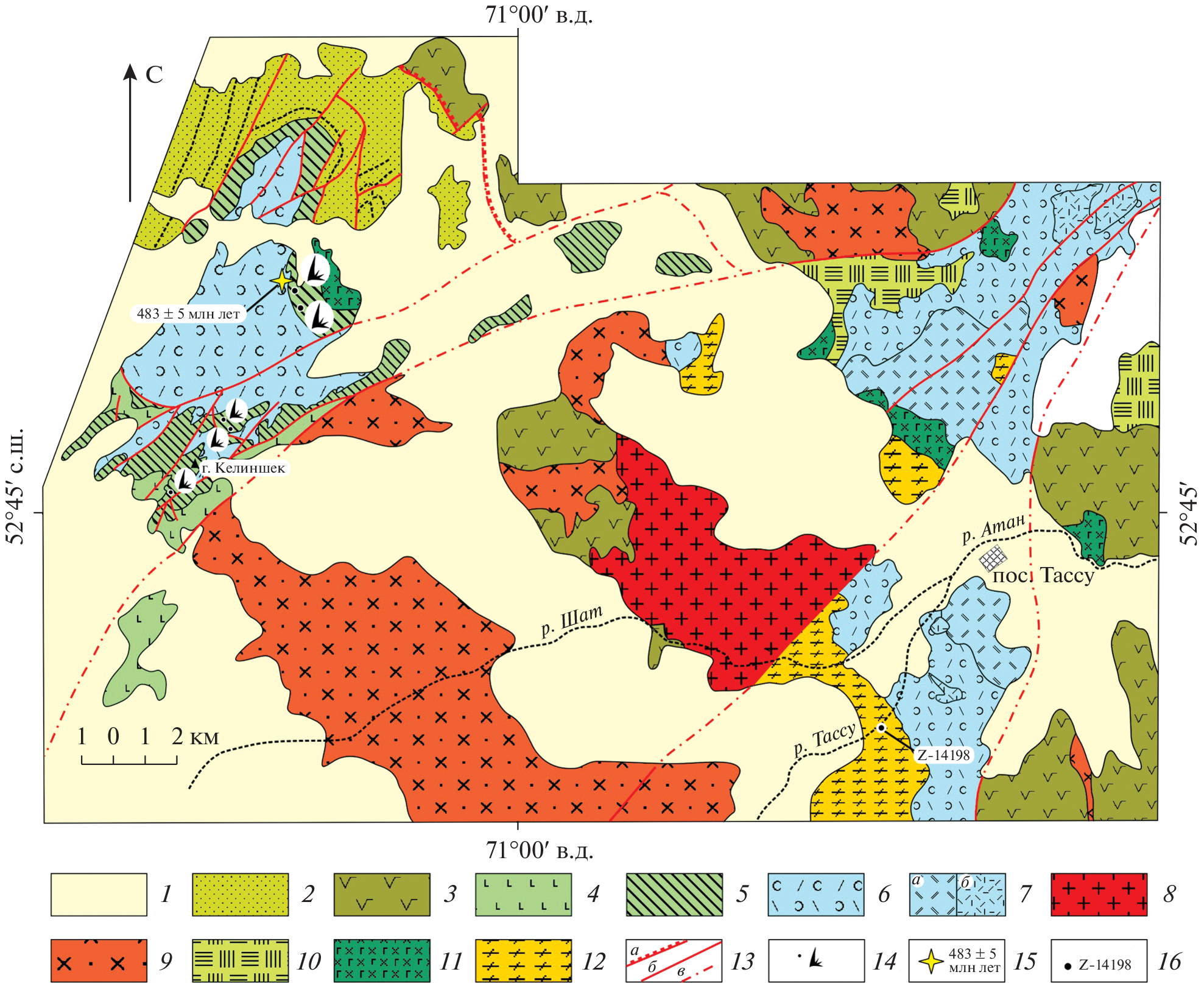 Проведено комплексное изучение верхнекембрийских и нижнеордовикских образований Северного Казахстана, обоснован их возраст, изучены структурное положение, строение и особенности состава пород. Установлено, что верхнекембрийские образования представлены грубообломочными толщами, основными щелочными эффузивами и габбро, кислые вулканиты и граниты представлены только валунами в конгломератах. Для нижнего ордовика характерны базальт-риолитовые серии, кислые щелочные вулканиты и гранитоиды. Реконструированы латеральные ряды структур активной континентальной окраины для позднего кембрия и раннего ордовика. В позднем кембрии латеральный ряд включает только структуры области тылового растяжения, где происходило формирование комплексов с внутриплитными геохимическими характеристиками. В латеральном ряду структур раннего ордовика выявлены фронтальная вулканическая область, где распространены островодужные вулканиты, и область тылового растяжения с внутриплитными кислыми вулканитами и гранитами. Предполагается, что различия латеральных рядов структур могут быть связаны с изменением режима активной континентальной окраины на границе кембрия и ордовика, ‒ когда трансформный режим, при котором отсутствует типичный надсубдукционный магматизм, сменился конвергентным магматизмом с широким распространением островодужных вулканитов.