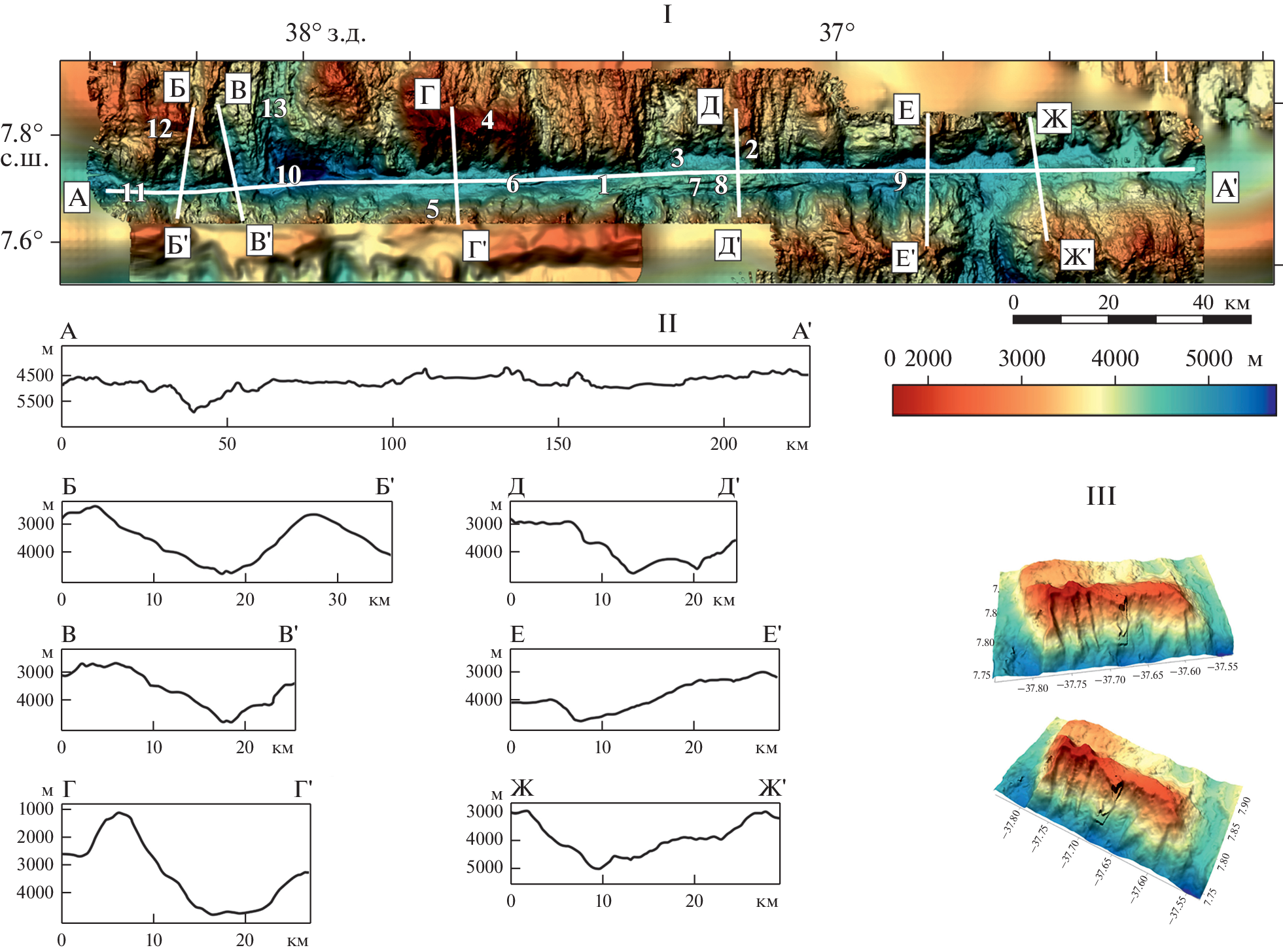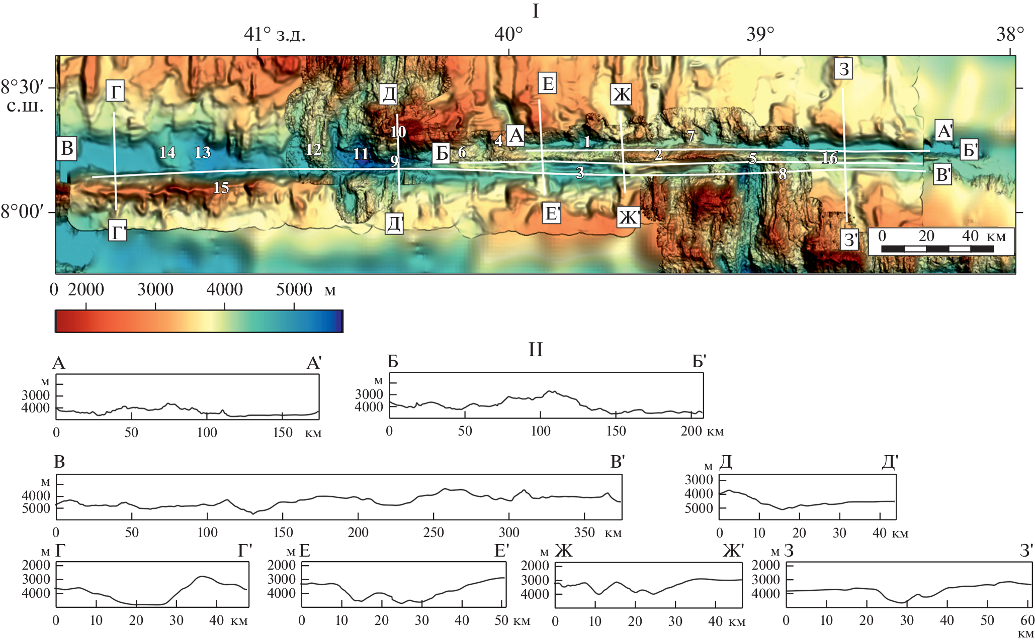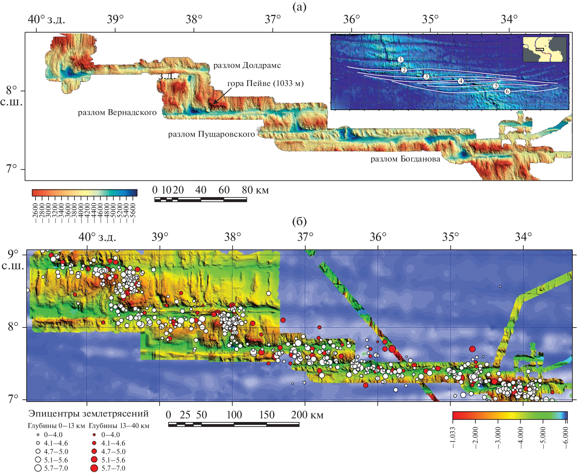 В статье приведены результаты анализа структуры и морфологии разломных зон, образующих мегатрансформную систему Долдрамс (МСД), расположенную в северной части Приэкваториальной Атлантики (6.5°‒9° с.ш.) и включающую трансформные разломы Вернадского, Богданова, Пущаровского и мегатрансформ Долдрамс. В работе использовалась батиметрическая карта, построенная по данным многолучевого эхолотирования дна в ходе 45-го рейса НИС “Академик Николай Страхов”. Установлено, что крупномасштабные вариации ширины разломных долин определяются распределением напряжений, поперечных к разлому. Для участков, где преобладает транспрессия, характерны более узкие разломные долины, в местах преобладания транстенции долины расширяются. Различие геодинамических обстановок в пределах мегатрансформной системы Долдрамс обусловлено различием направления спрединга, которое при движении с юга на север изменяется от \(\perp \)89° до \(\perp \)93°. Глубина разломных долин последовательно увеличивается от периферии мегатрансформной системы Долдрамс (разломы Богданова и Долдрамс) к центру (разлом Пущаровского) в соответствии с уменьшением температуры верхней мантии. В каждом разломе глубина долины уменьшается от зон интерсекта рифт‒разлом в сторону центра активной части до фоновой глубины. Предполагается, что наблюдаемый подъем днища долины возникает из-за разуплотнения верхней мантии, вызванного серпентинизацией ультраосновных пород. Нарушение выявленных закономерностей вариаций ширины и глубины разломных долин происходит в результате образования в разломной зоне хребтов и поднятий различной природы. В осевых зонах активных частей разломных долин широко распространены медианные хребты, простирающиеся параллельно разлому и представляющие собой серпентинитовые диапиры, выжатые выше поверхности дна. На южных бортах долин разломов Долдрамс и Пущаровского около 10‒11 млн лет назад в результате флексурного изгиба краевой части литосферной плиты в условиях транстенсии образовались трансверсивные хребты, находящиеся в настоящее время в западных пассивных частях. Трансверсивный хребет на северном борту разлома Вернадского, в состав которого входит гора Пейве, сформировался между 3.65‒2.4 млн лет. Частые перескоки оси спрединга в этом районе привели к разделению трансверсивного хребта на три блока. В мегатрансформах, которые в активной части состоят из двух разломных долин, формируются межразломные хребты. Время их образования: в мегатрансформе Пущаровского 30‒32 млн лет назад, а в мегатрансформе Долдрамс ‒ ~4 млн лет назад. В силу криволинейности очертаний под давлением движущихся литосферных плит межразломные хребты испытывают продольные (вдоль разлома) напряжения сжатия и растяжения, компенсируемые вертикальными подъемами их отдельных блоков и образованием депрессий, пулл‒аппарт впадин и спрединговых центров (последние развиты только в мегатрансформе Пущаровского). Структурообразующие процессы, определяющие строение и морфологию разломных зон в составе мегатрансформной системы Долдрамс, связаны своим происхождением со спрединговой и трансформной геодинамическими системами.