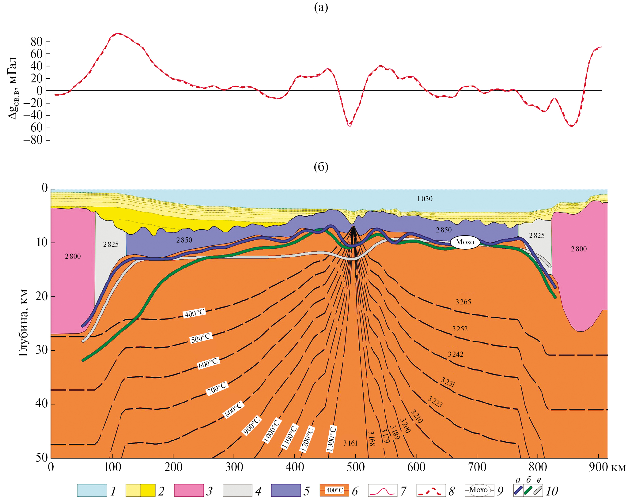 1 — водная толща; 2 — слои осадочного чехла; 3‒5 — кора: 3 — континентальная, 4 — зоны перехода континент-океан; 5 — океаническая; 6 — значения изотерм и границы блоков верхней мантии; 7‒8 — гравитационные аномалии от модели: 7 — наблюденные Dgсв.в.; 8 — расчетные Dg; 9 — граница Мохо; 10 — кривые рельефа поверхности Мохо, извлеченные из цифровых моделей: а — финальной; б — из проекта ArcCRUST [57]; в — из проекта TEMAr [15]