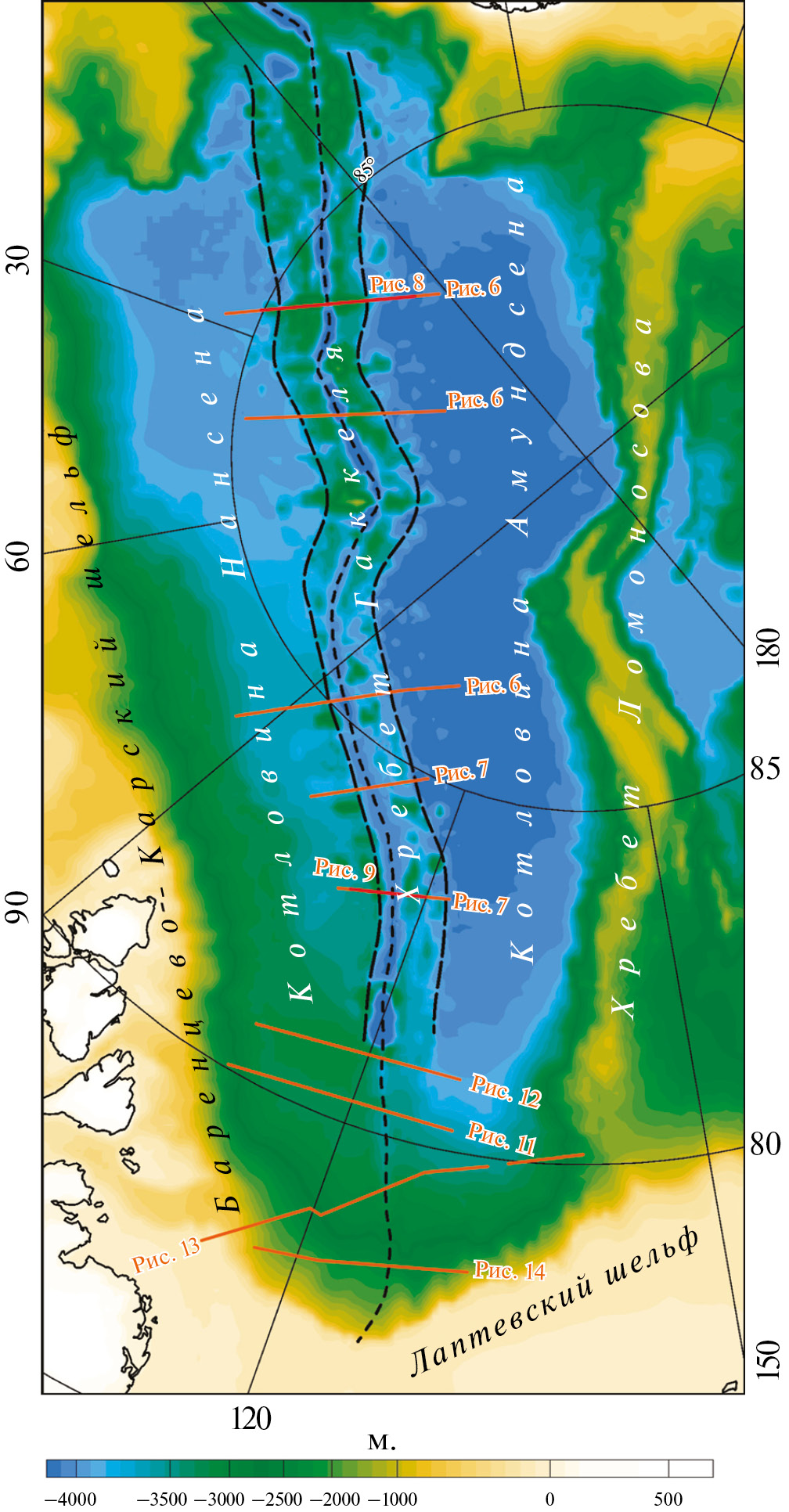Однако ряд выявленных в последние годы батиметрических, сейсмических, гравитационных и магнитных характеристик дна Евразийского бассейна вступают в противоречие с гипотезой одноэтапного образования бассейна [1, 26], а в юго-восточную его часть по результатам сейсмических исследований протягиваются толщи пород предположительно мезозойского возраста [3, 6, 49]. Эти данные делают актуальной задачу пересмотра истории образования и характера строения земной коры юго-восточной части Евразийского бассейна.