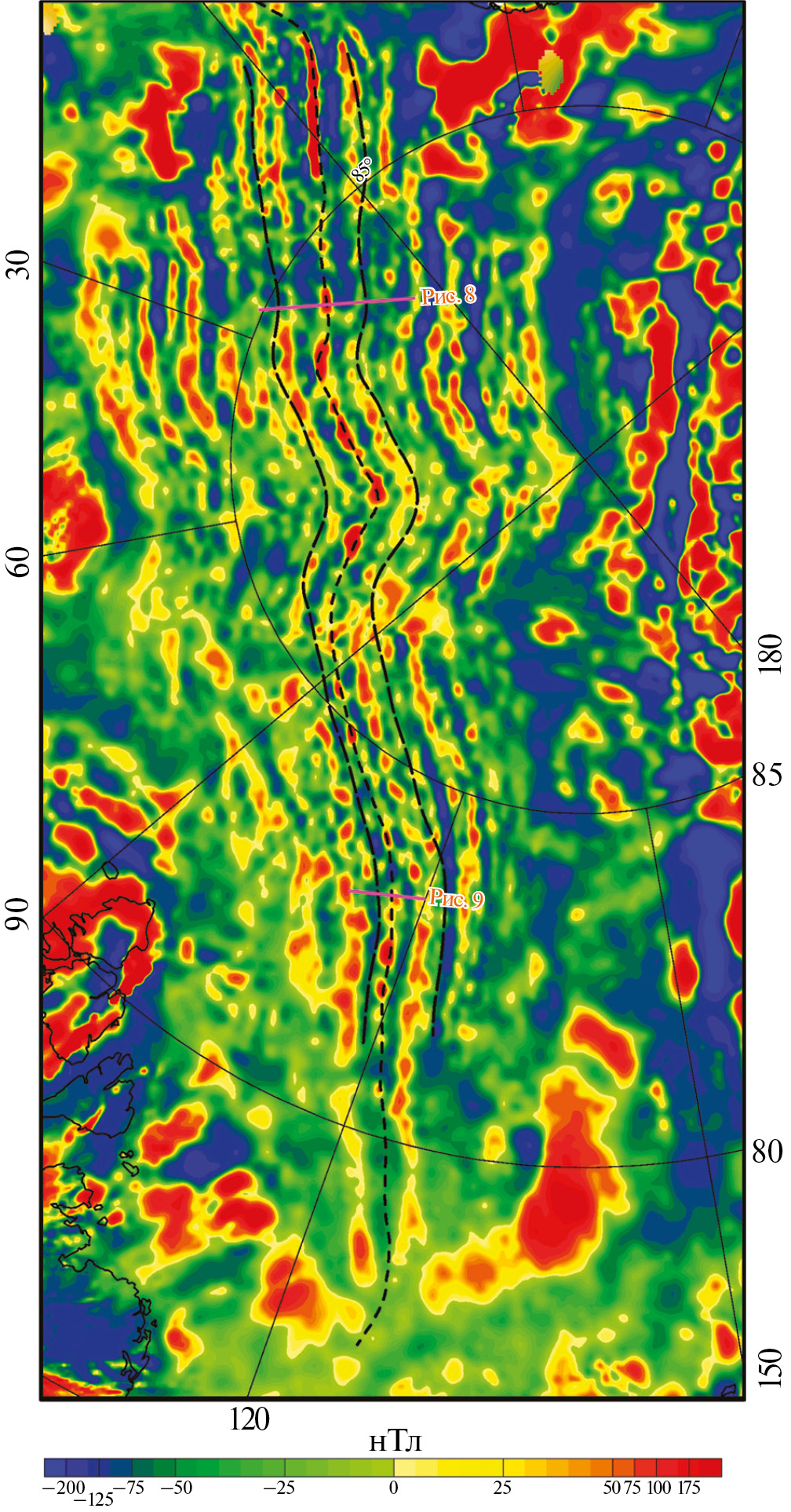 Рис. 2. Карта магнитных аномалий Евразийского бассейна Северного Ледовитого океана.