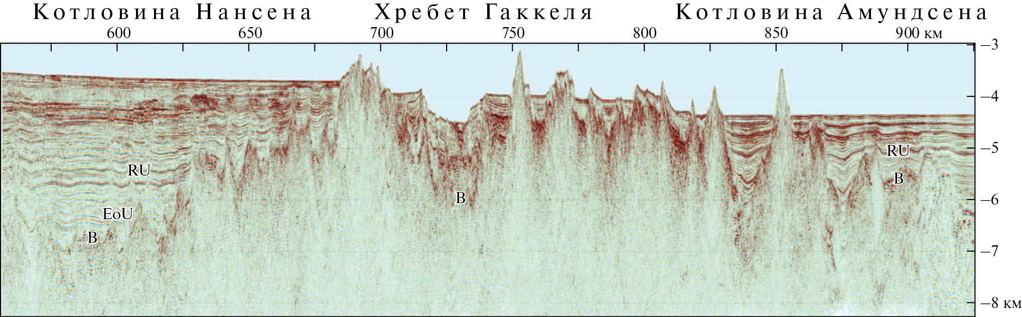 Представленный на рис. 4 сейсмический разрез демонстрирует типичный характер границ хребта Гаккеля с котловинами Нансена и Амундсена. Сам хребет аппроксимируется слабо наклонной платообразной поверхностью. В то же время границы хребта везде выражены перепадами в рельефе амплитудой в несколько сотен метров. На демонстрируемом разрезе эти перепады расположены в районе пикетов 690 и 815, то есть протяженность хребта в месте пересечения профилем 2014-07 составляет 125 км.