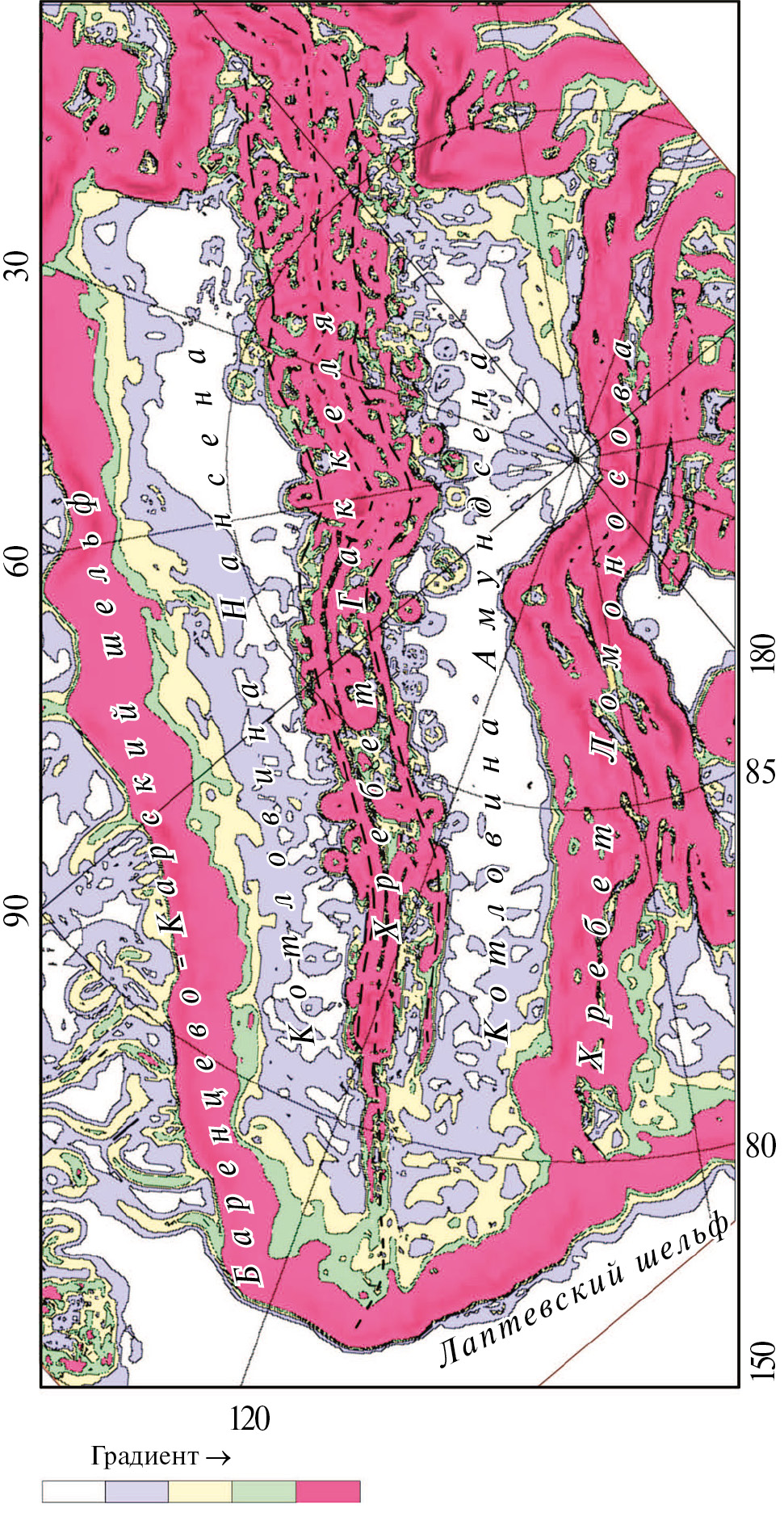 Карта гравитационных аномалий Евразийского бассейна также демонстрирует принципиальные различия в строении различных сегментов хребта Гаккеля (рис. 3).