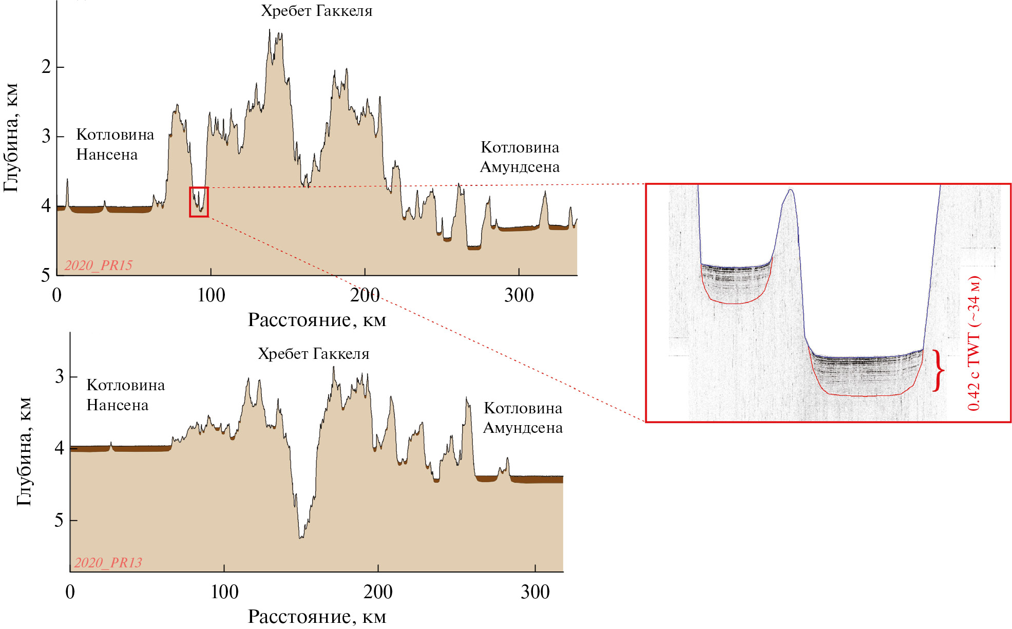 Новые данные о рельефе и строении верхней части разреза осадочного чехла западного и центрального сегментов хребта Гаккеля были получены в ходе экспедиционных работ 2019 и 2020 гг. на судне “Академик Федоров” в сопровождении атомных ледоколов ФГУП “АТОМФЛОТ” (Россия). Было выполнено 15 пересечений хребта Гаккеля и его рифтовой долины с использованием профилографа и сейсмоакустического профилирования. Использовался глубоководный параметрический профилограф TOPAS PS18 (Kongsberg, Норвегия), входивший в состав навигационно-гидрографического комплекса на базе многолучевого эхолота EM122. Для обеспечения оптимальной глубины проникновения, высокой разрешающей способности и наилучшего соотношения сигнал/шум, сбор данных осуществлялся в режиме “CHIRP”-импульс с линейной частотной модуляцией и диапазоном частот от 2 до 6 кГц, длина импульса 10 или 20 мкс. Непрерывное сейсмоакустическое профилирование проводилось с буксируемыми забортными устройствами, включавшими электроискровой источник “Спаркер” с центральной частотой излучения в диапазоне 200–300 Гц и многоканальная аналоговая сейсмокоса SplitMultiSeis Streamer с количеством каналов от 16 до 24 и шагом между каналами – 2 м. Регистрация проводилась на сейсмостанции SplitMultiSeis Station Betta и SplitMultiSeis Station 24bit с 16- и 24-разрядными АЦП соответственно.