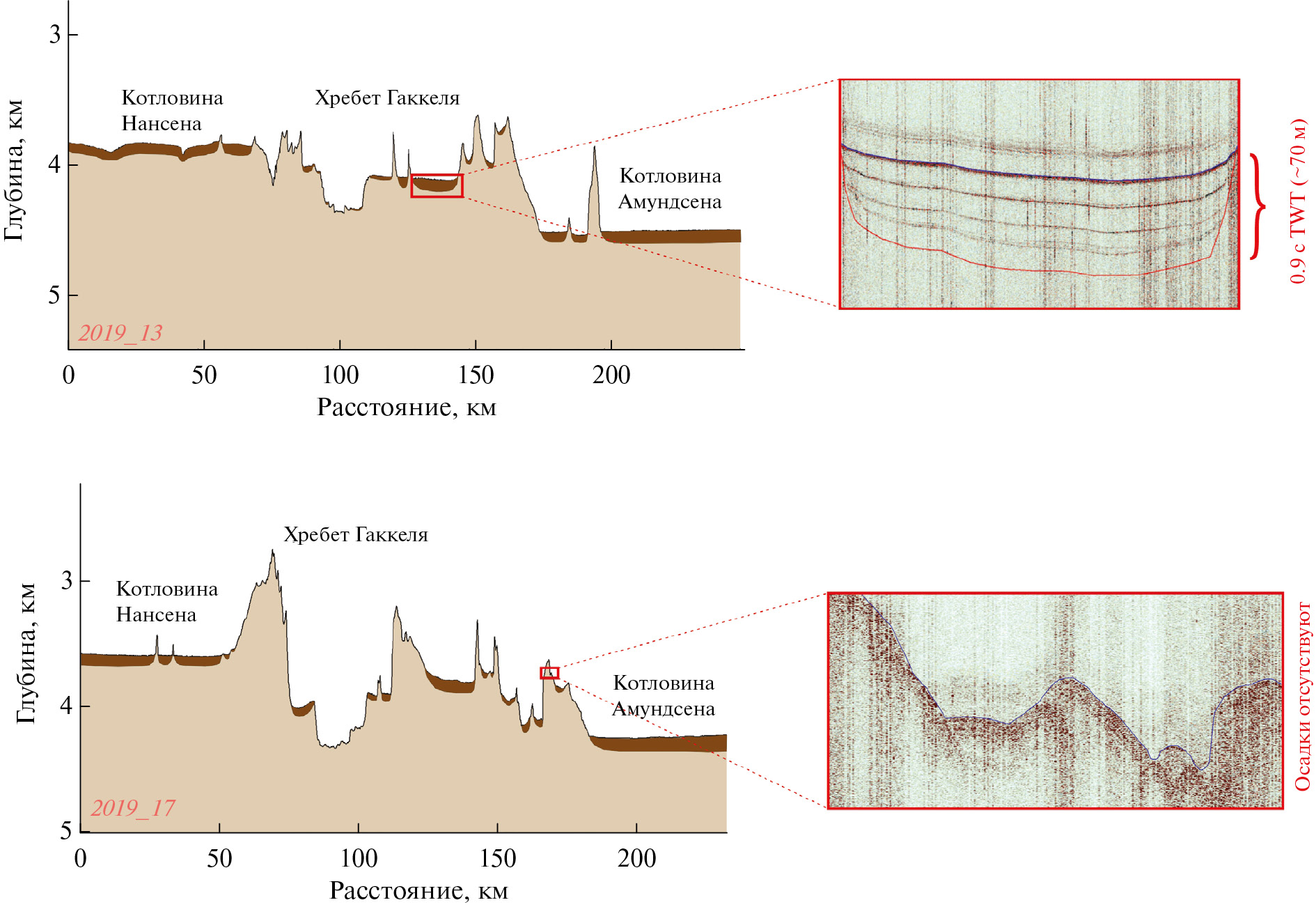 Рис. 7. Результаты пересечения с профилографом хребта Гаккеля в центральной его части по профилям 2019_13 и 2019_17. Положение профилей ‒ см. рис. 1.