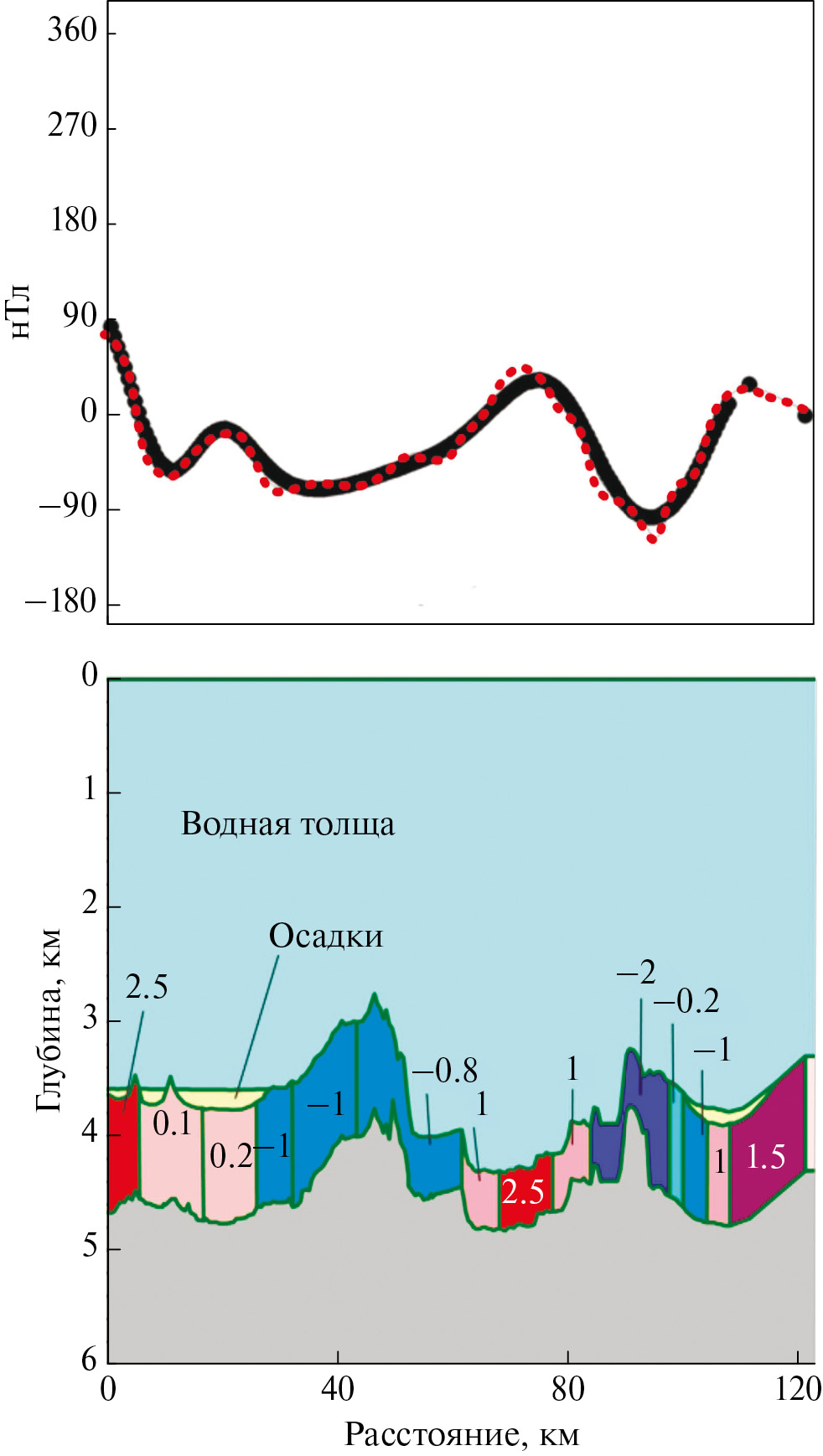 Показано: наблюденные значения (точки черным); расчетные значения намагниченности (точки красным); корреляция экстремумов рельефа и магнитных аномалий в зоне обратной намагниченности (тонкие бисерные линии).