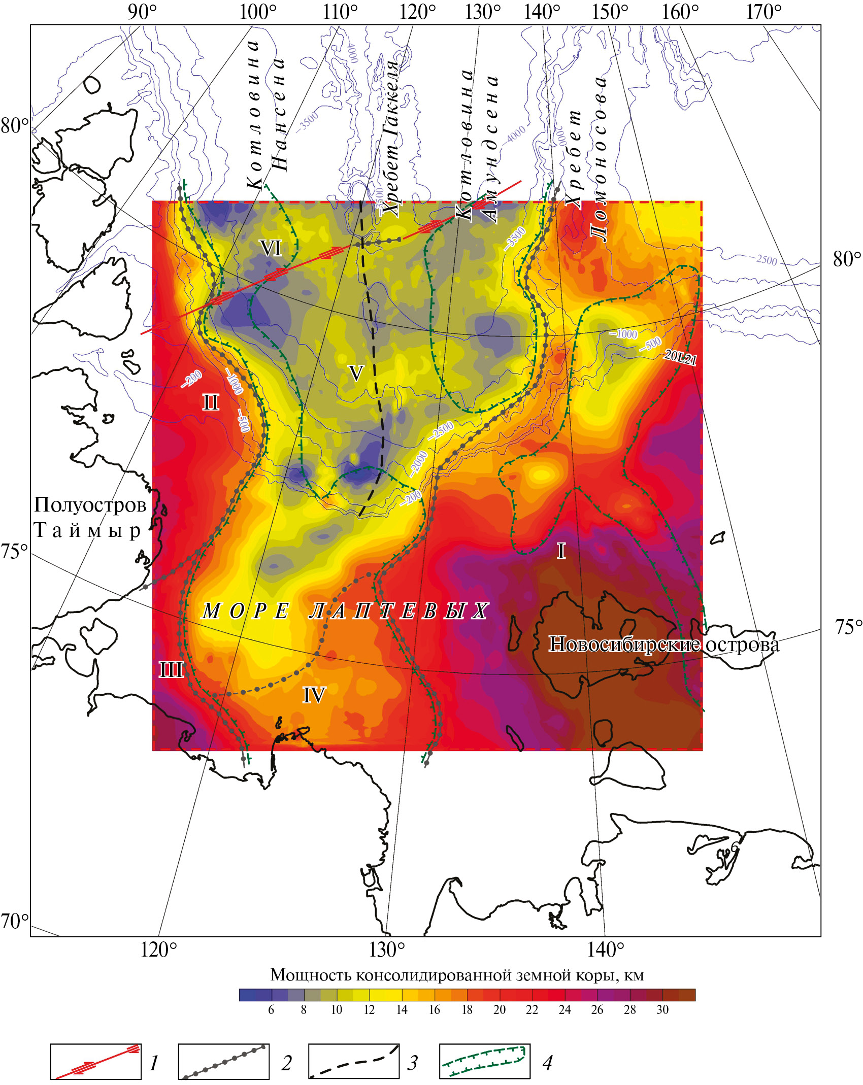 Обозначено: I – платформенная область на докембрийском кристаллическом фундаменте; II ‒ Таймырско-Североземельская позднепротерозойская складчатая область; II ‒ область киммерийской переработки докембрийского фундамента; IV – Верхоянская складчатая область; V – растянутая континентальная кора и ареалы мезозойской океанической земной коры; VI – океаническая земная кора.