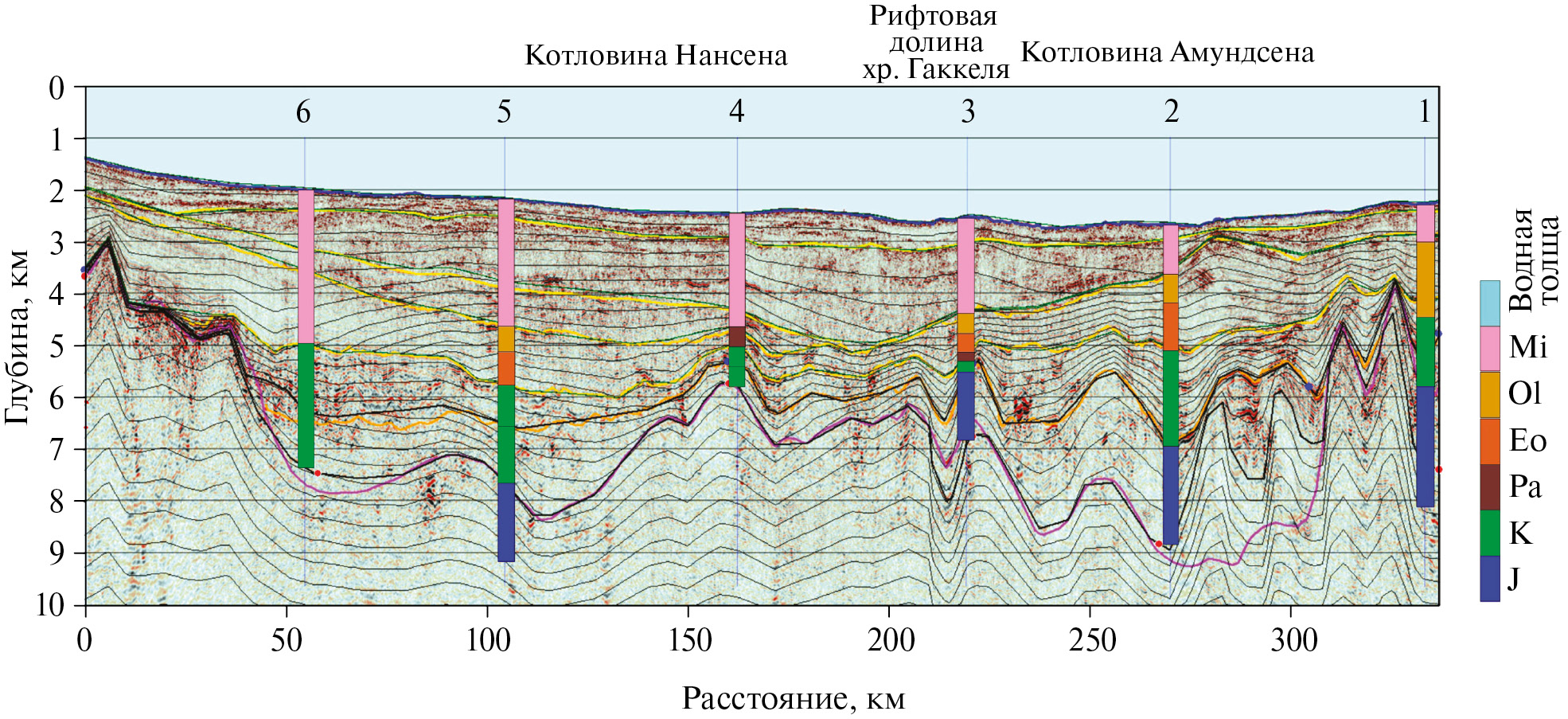 После окончания цикла сейсмических работ в Канадском бассейне основные выделяемые на разрезах сейсмические границы были привязаны к скважинам, пробуренным в бассейне Маккензи и на северном склоне Аляски [35]. Время формирования верхней границы (R10) было определено как 11.6 млн лет назад, второй границы (R30) ‒ 33 млн лет назад, и нижней границы (R40) – 56.2 млн лет назад. Относительно границы R30 есть сомнения, не следует ли перенести время ее формирования в осадочной толще с раннего олигоцена в ранний миоцен, 23 млн лет назад. В остальном реперные определения времени формирования сейсмических границ в Канадском бассейне выглядят надежными.