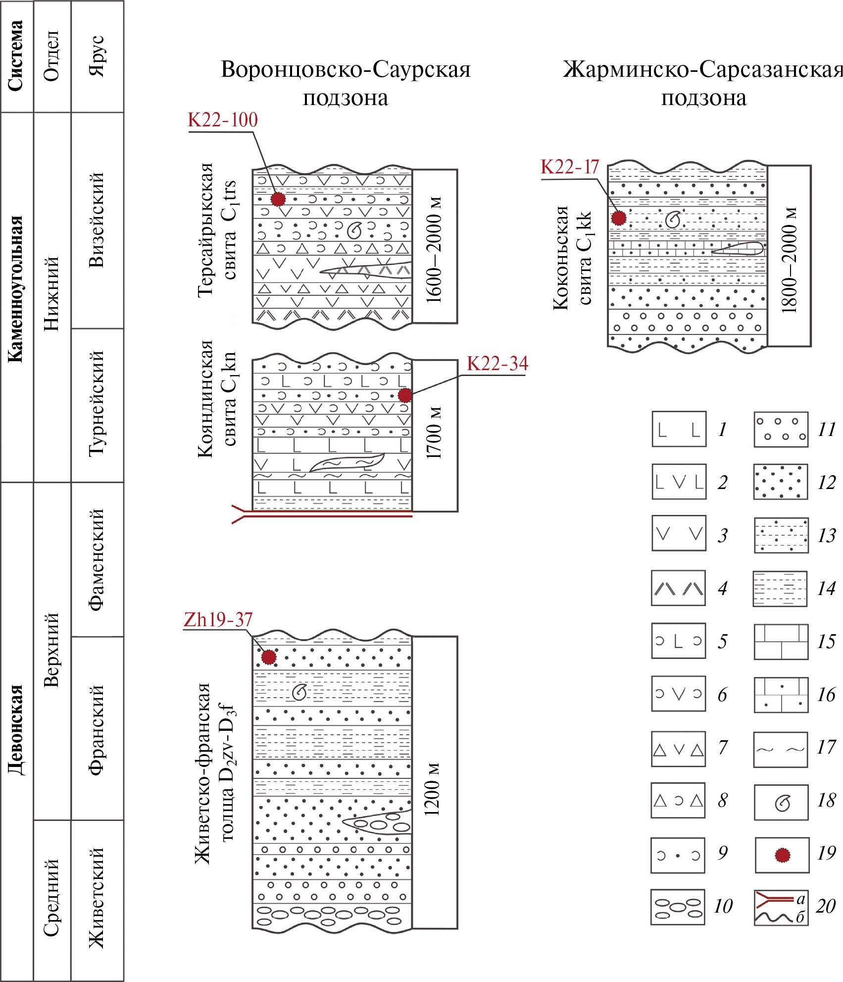 Рис. 3. Схематические литологические колонки изучаемых стратиграфических подразделений Жарма-Саурской зоны (по данным [4, 5], с изменениями и дополнениями).