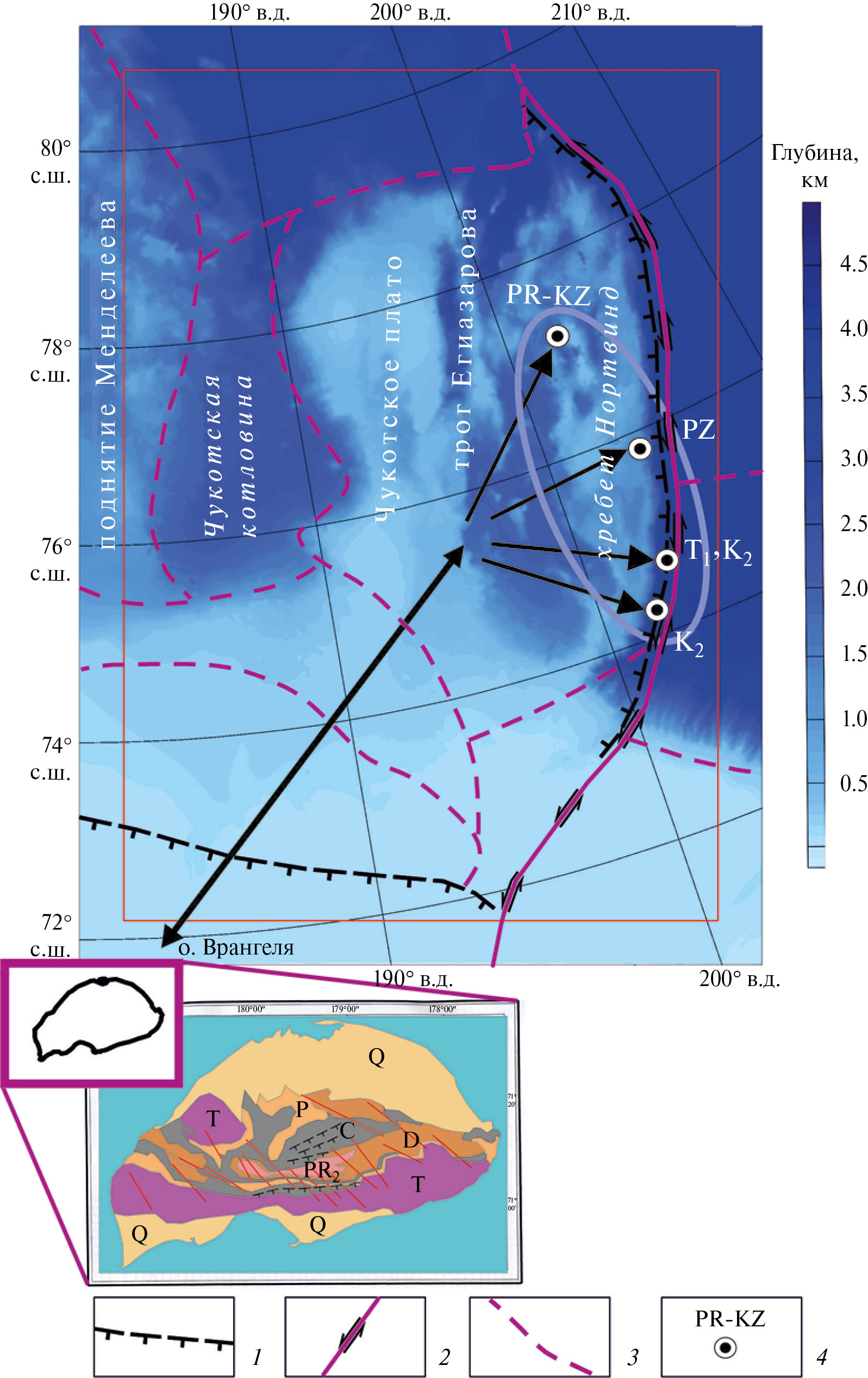Врангелевское поднятие характеризуется положительными аномалиями силы тяжести и магнитными аномалиями небольшой амплитуды, свойственными континентальной земной коре с гранитно-метаморфической верхней корой (см. рис. 8, 1). Врангелевское поднятие ограничено с севера разломной зоной, по которой оно надвинуто на Северо-Чукотский прогиб (см. рис. 8, 1).
