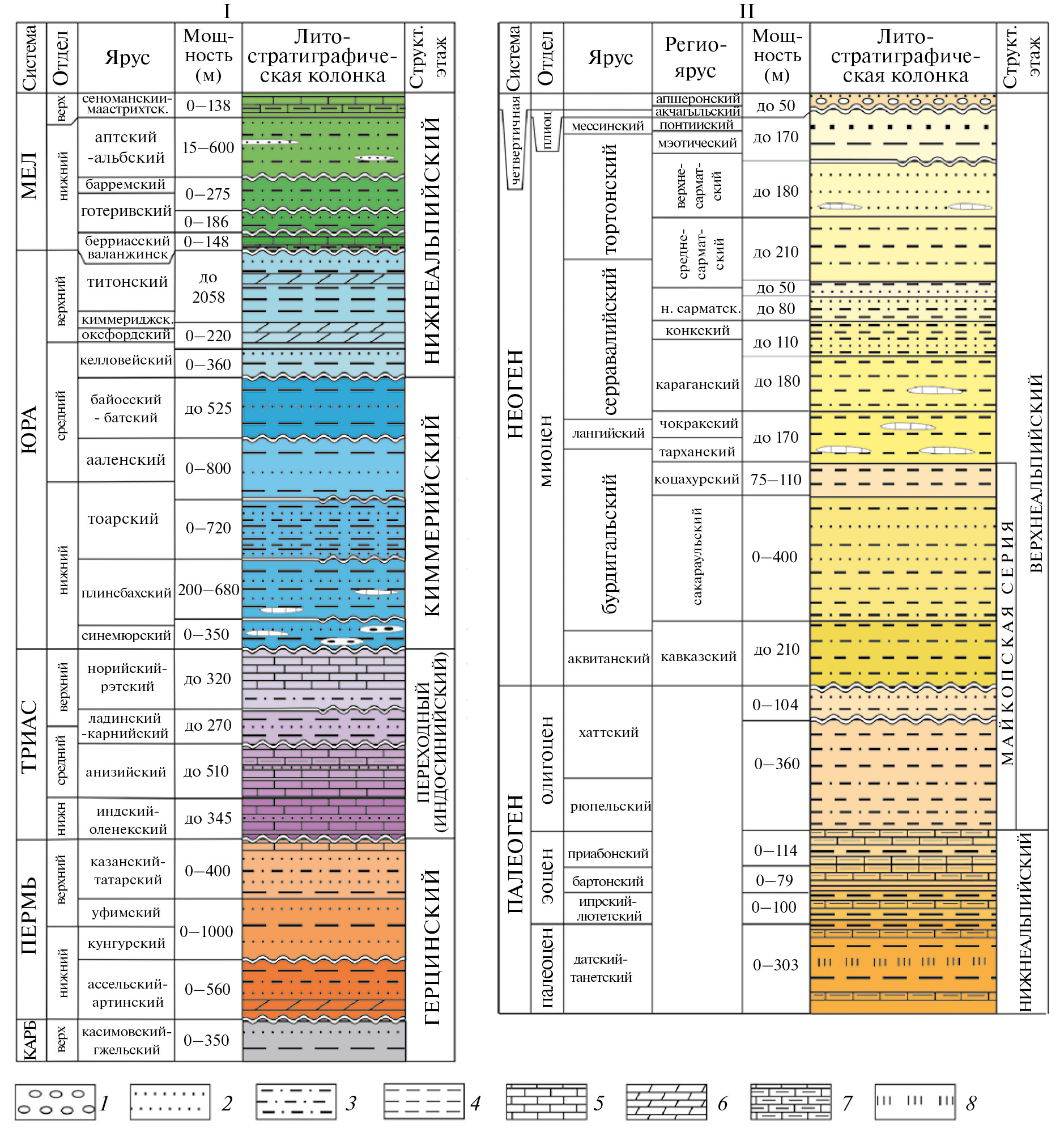 Рис. 2. Сводная стратиграфическая колонка Северного склона Большого Кавказа и Западного Предкавказья (бассейн р. Белой) в районе Адыгейского сектора (по данным [17]).