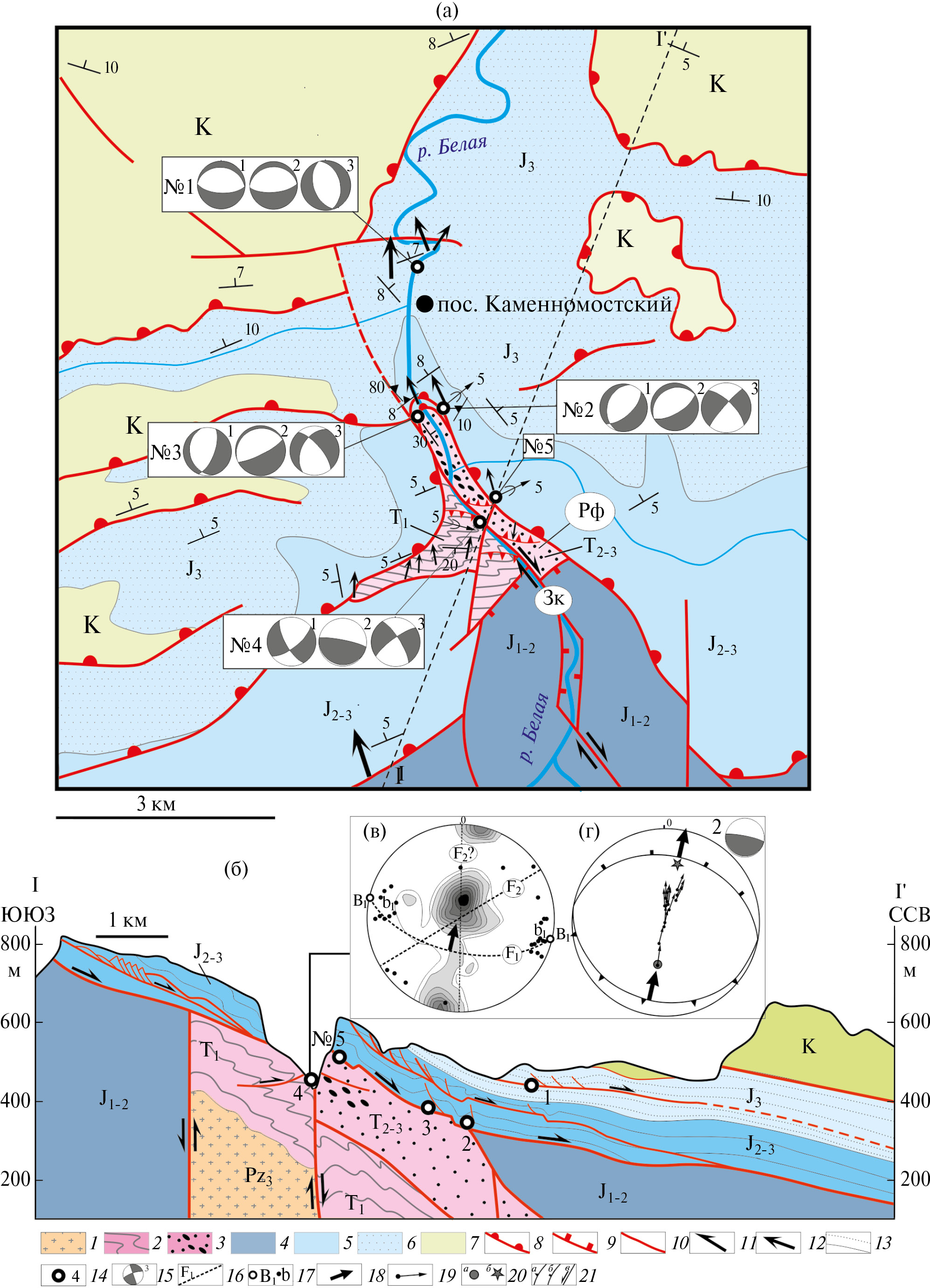 Рис. 3. Геологическая схема северной части Адыгейского сегмента Большого Кавказа (по данным [17], с изменениями и дополнениями).