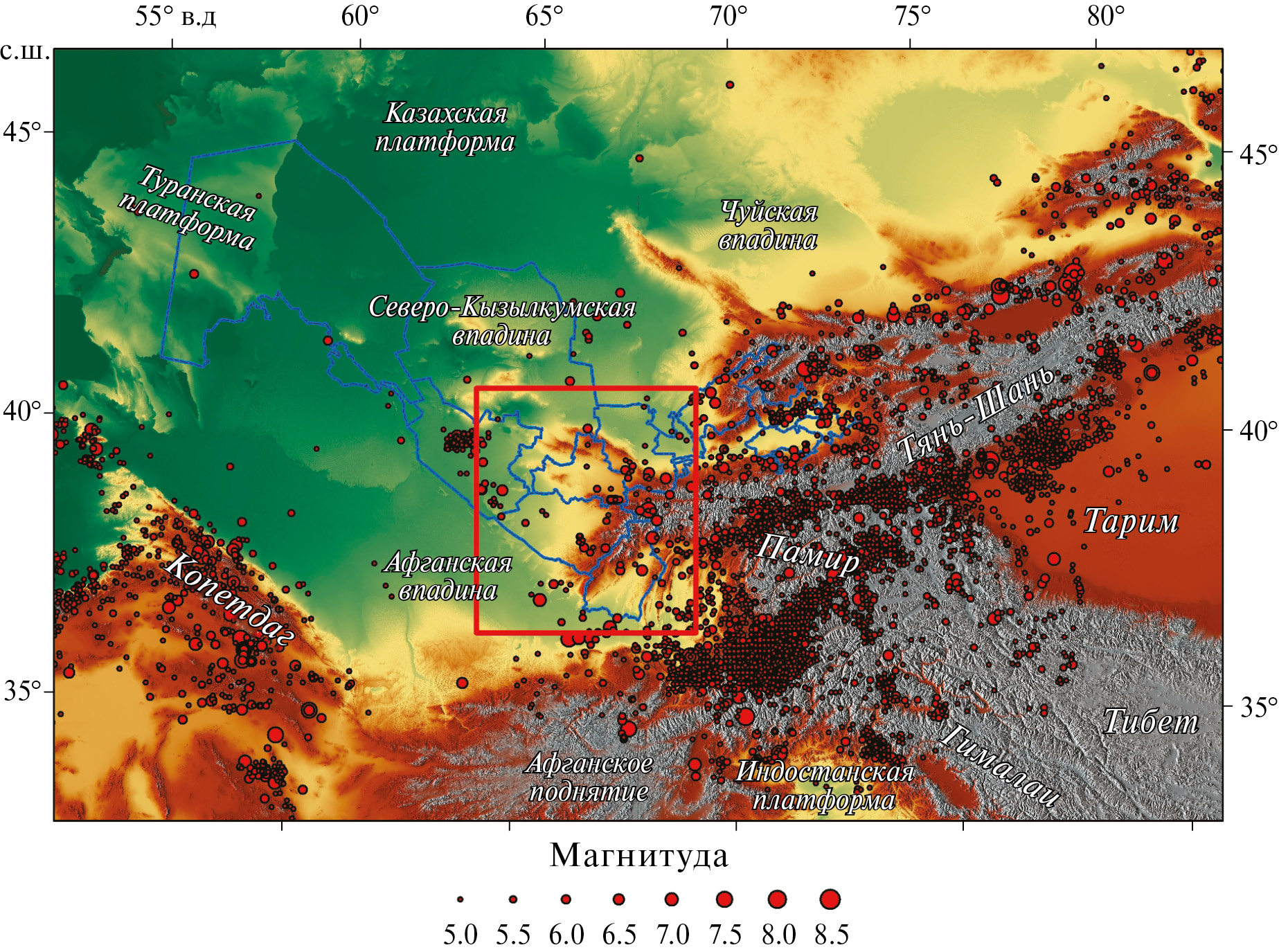 Для получения количественных характеристик сейсмической опасности Центрального и Южного Узбекистана исследовалась территория, ограниченная географическими координатами 37°.00′–41°.30′ с.ш. и 64°.00′–69°.30′ в.д.. Показано положение региона исследования в общей структуре Высокой Азии показано (рис. 1).