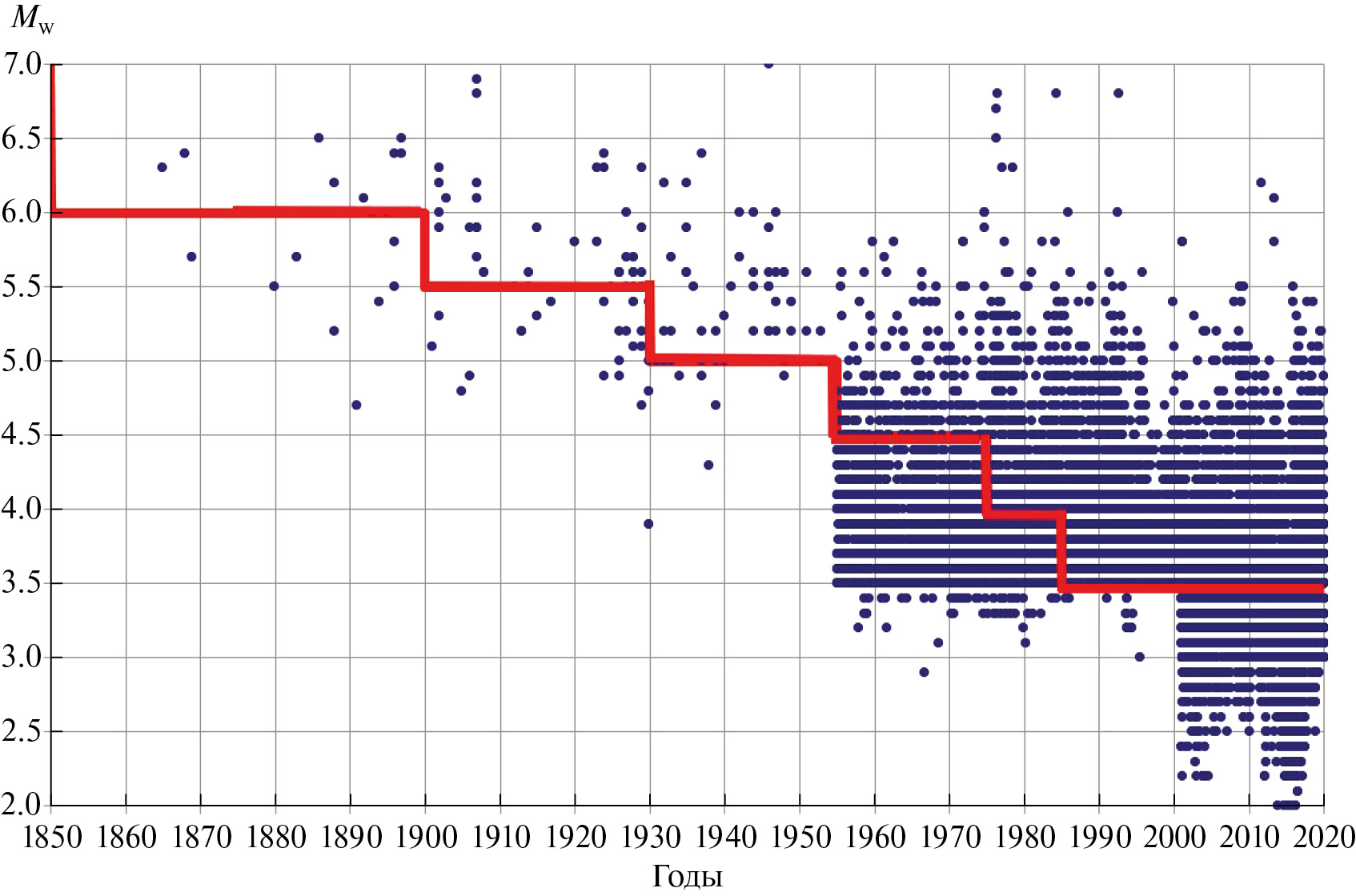 Показаны временные интервалы представительной регистрации землетрясений различных магнитуд Mw (рис. 4).