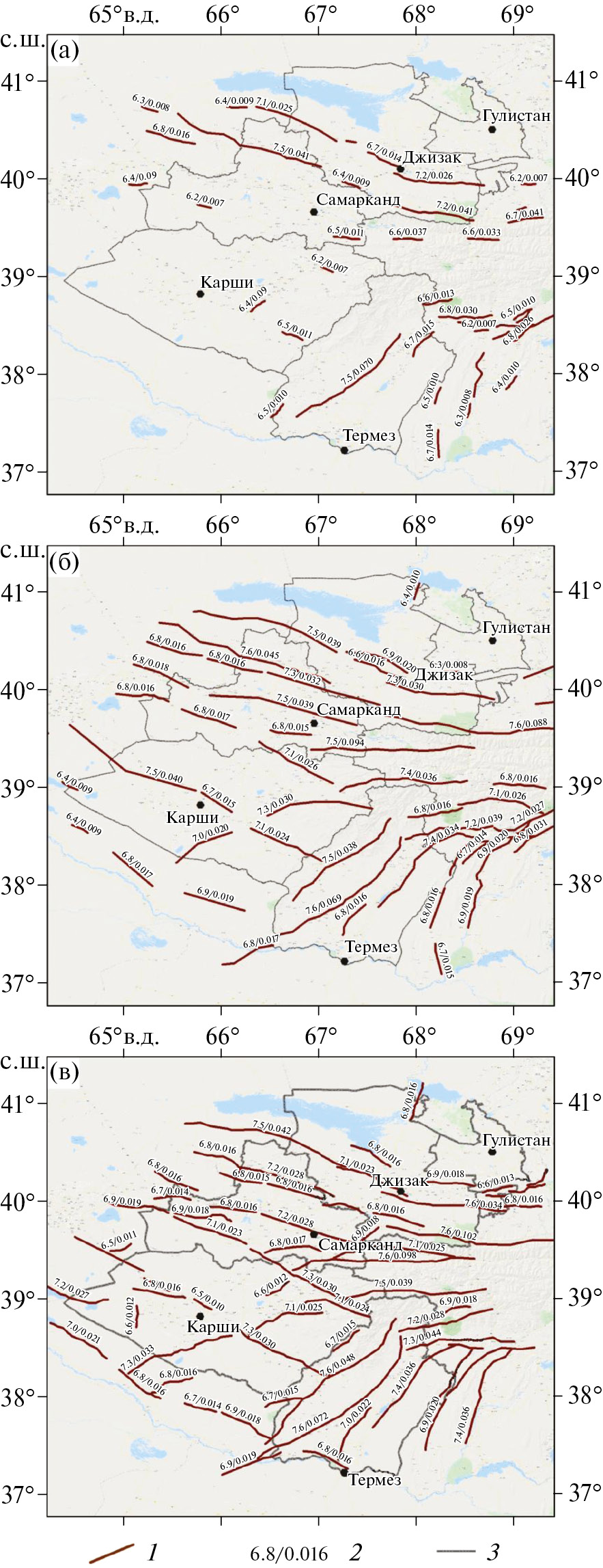 Приведена карта эпицентров землетрясений, произошедших на территории Центрального и Южного Узбекистана, начиная с исторического периода времени по 2023 год, построенная по региональному каталогу [1, 64] (рис. 3, а). Самое ранее историческое землетрясение в региональном каталоге датировано 1208 годом.