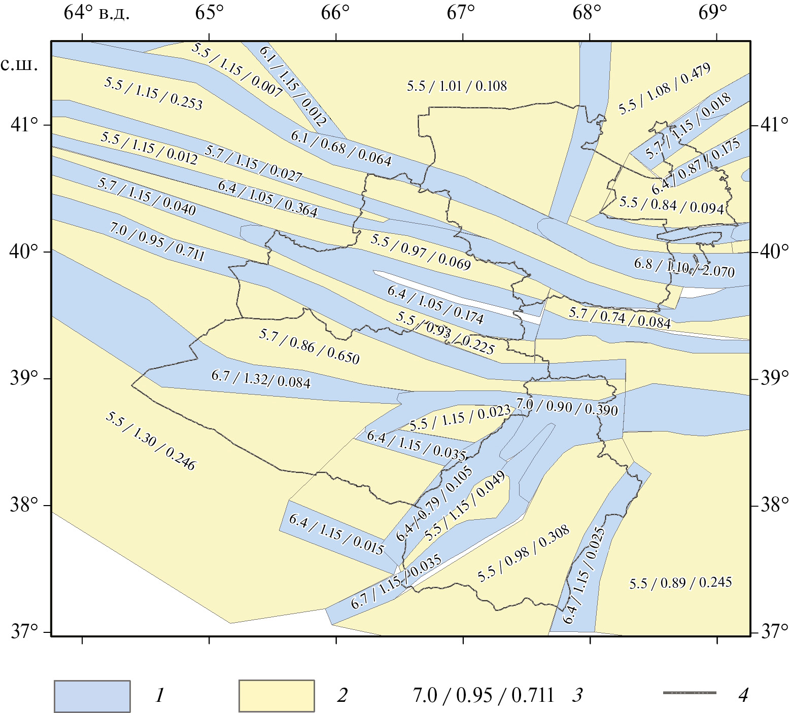 При оценке представительности землетрясений регионального каталога мы опирались на исследования, в которых на основе данных о сети сейсмических станций, действовавшей в 1930, 1940, 1950, 1955, 1965, 1975, 1985 гг., и чувствительности приборов на каждой станции, была построена серия карт, показывающих изолинии нижнего энергетического уровня представительных землетрясений [31, 64]. Представительность землетрясений на этих картах дается для энергетического класса К и магнитуды ML, которая, впоследствии через соотношения (1)‒(2), переводилась в представительность каталога в магнитуде Mw.