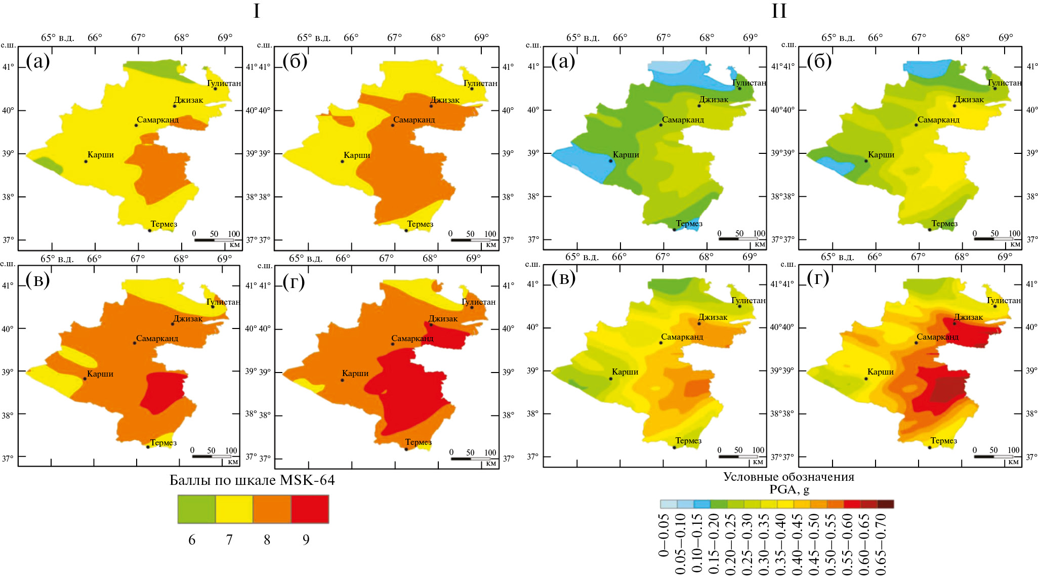 The calculation of seismic impacts is carried out using several attenuation dependencies developed for the Central Asian region. The weights for the attenuation dependencies are selected based on the ranking procedure according to the degree of applicability to the study area. An assessment of seismic hazard in engineering parameters of seismic vibrations was carried out. Taking into account the recurrence periods of seismic impacts, probabilistic maps of detailed seismic zoning of the territory of Central and Southern Uzbekistan were developed.
