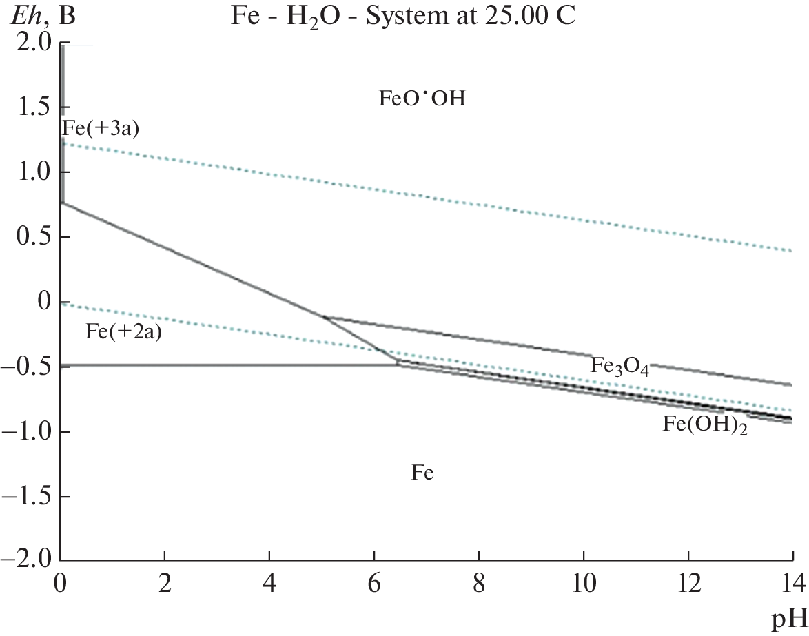 The thermodynamic stability of iron and magnesium ions at different acidity of an aqueous medium was determined using chemical thermodynamics methods and Pourbaix diagrams. The temperature dependence of the thermodynamic functions of corresponding reactions was calculated. The thermodynamic feasibility of the reactions of replacing potassium and sodium ions in aqueous solutions of humic acid salts containing carboxyl and hydroxyl functional groups with iron and magnesium ions was established. The resulting water-soluble iron and magnesium humates can have a high potential for practical use.